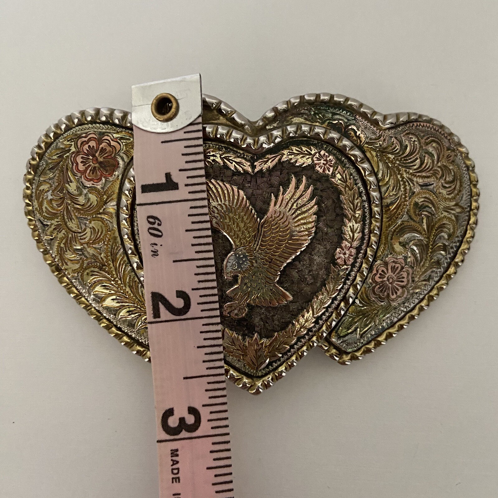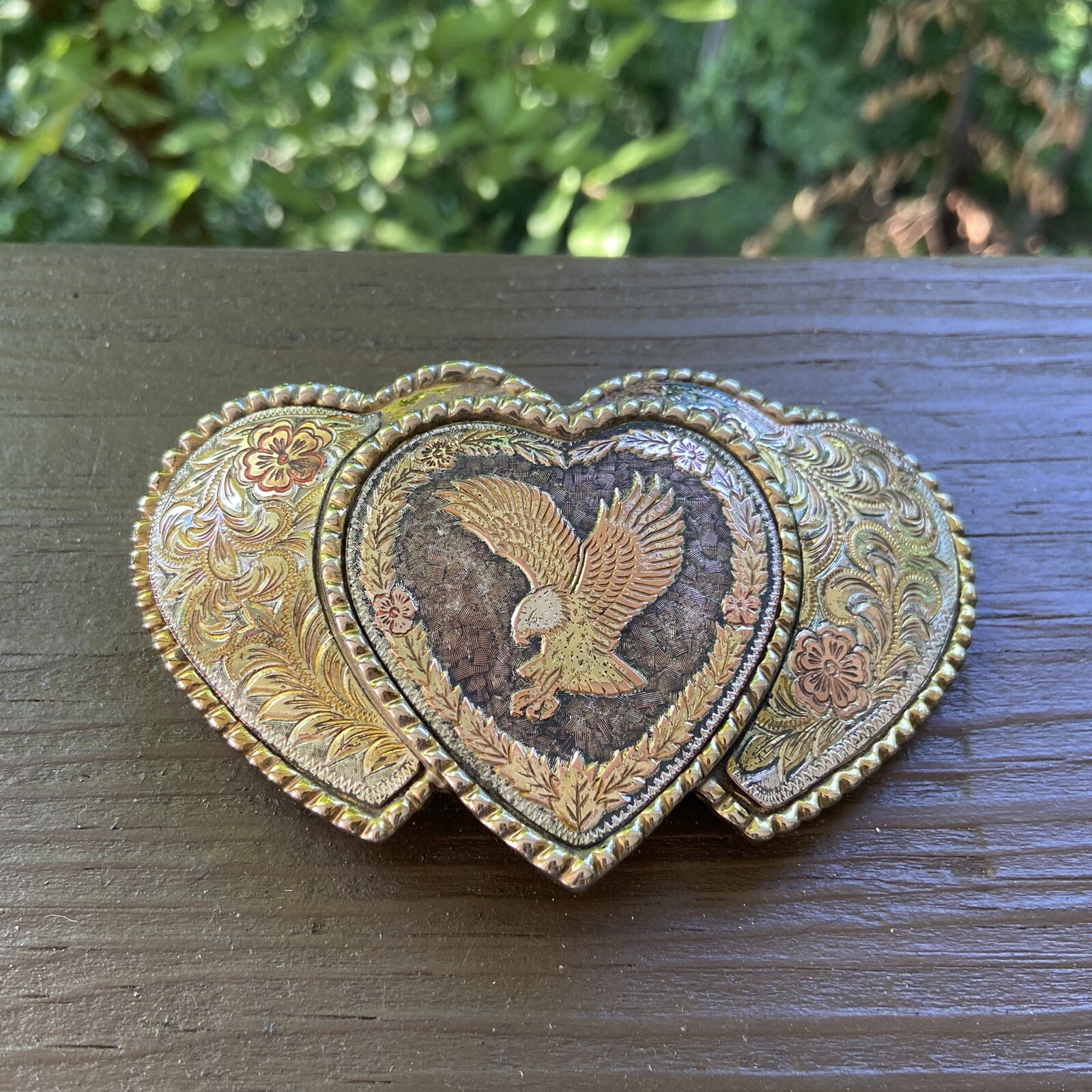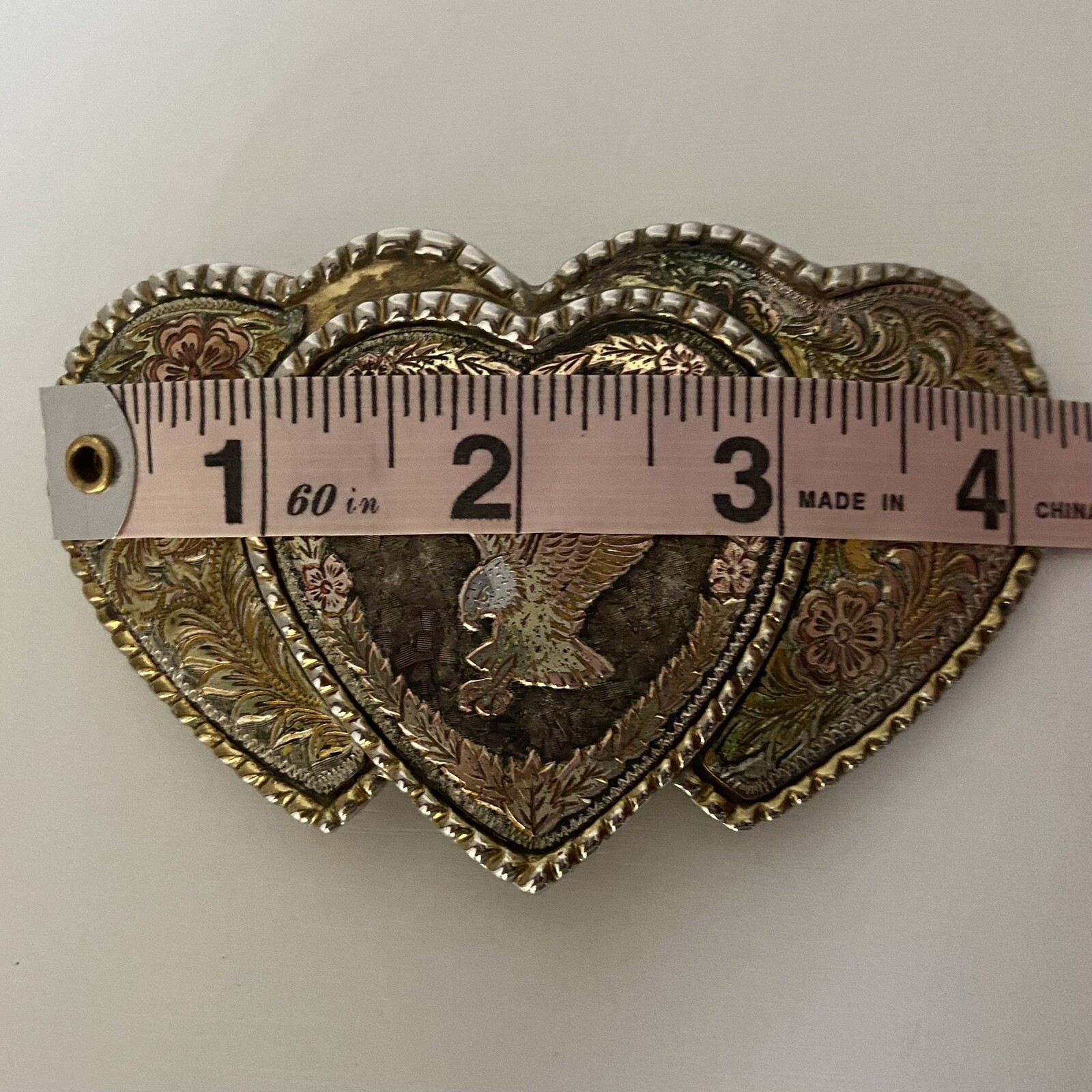 W USA Rare Triple Heart Eagle Belt Buckle Heavy Metals Western Statement Piece