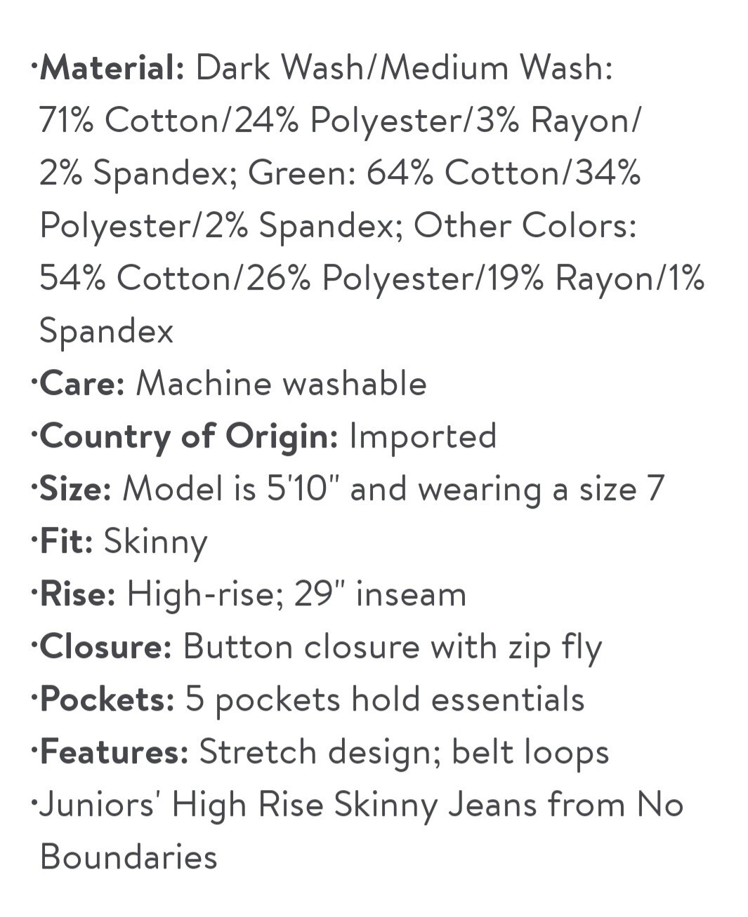 No Boundaries Women's Dark Wash High Rise Skinny Jeans Size 3 New