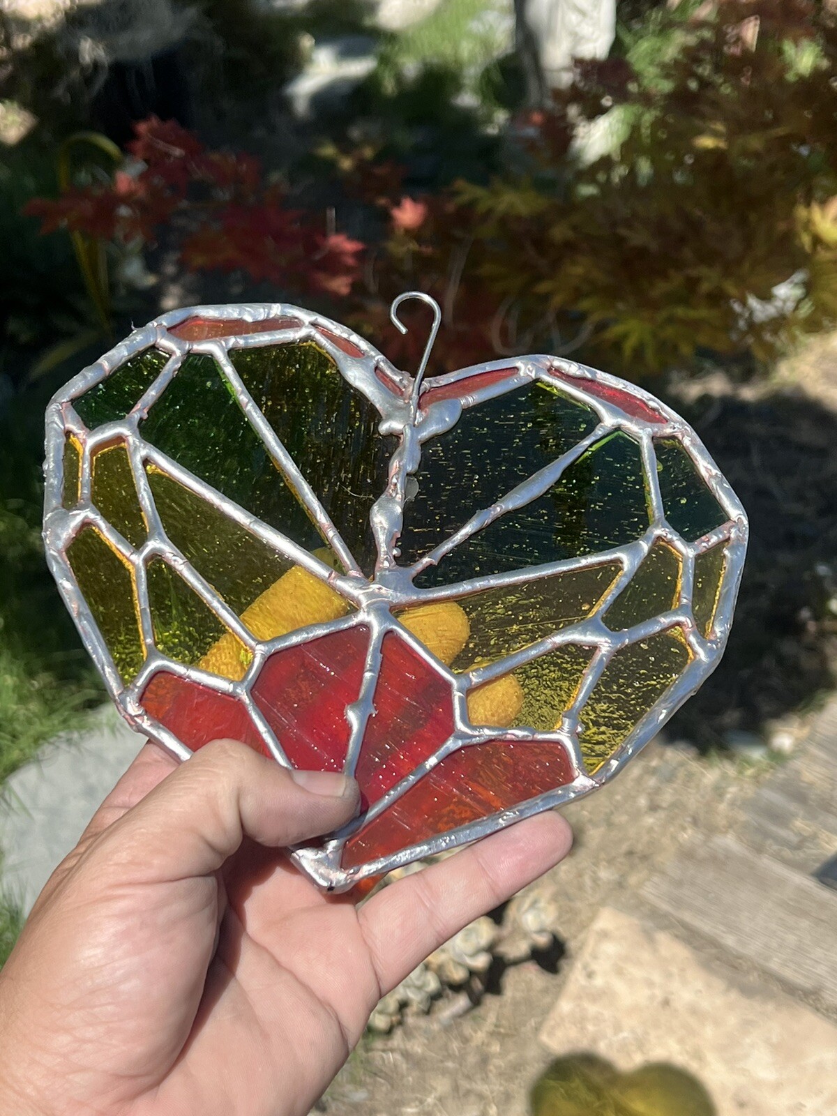 как выглядит Handmade Stained glass Red Yellow Green Heart Sun catcher 8x7 Inch Approx, фото