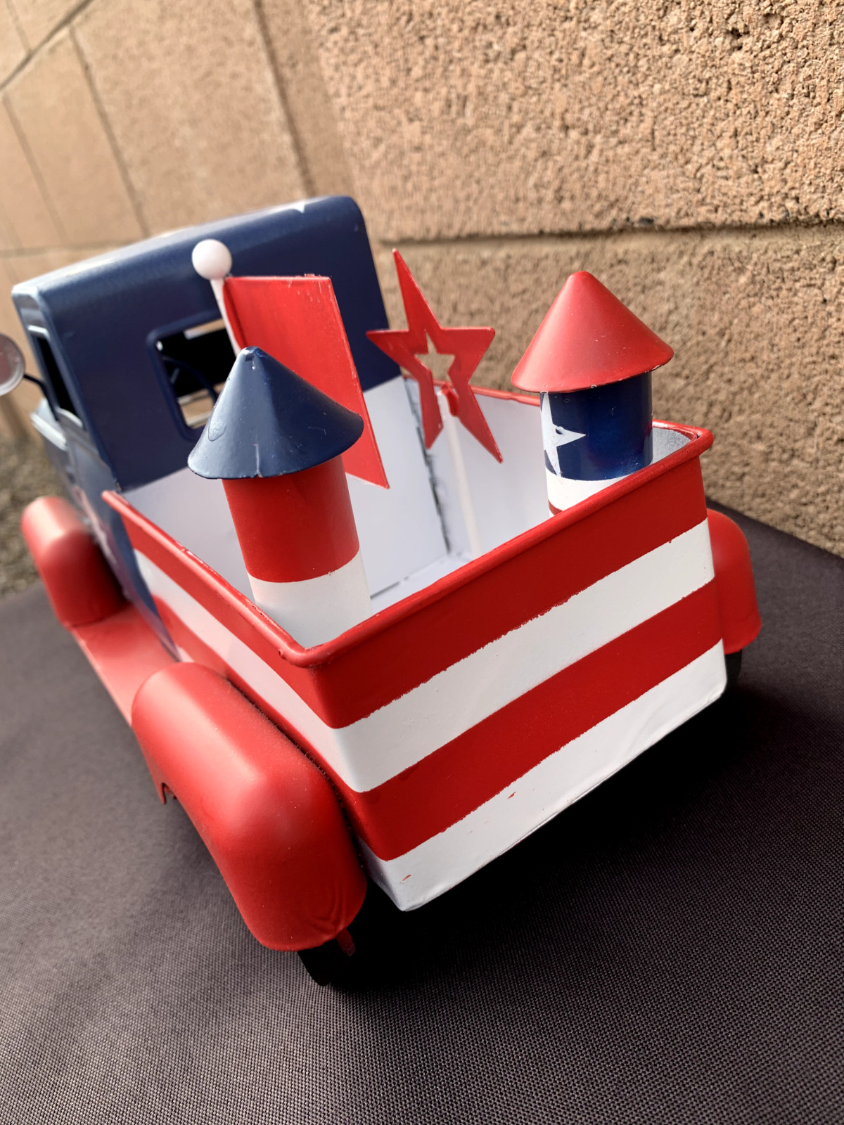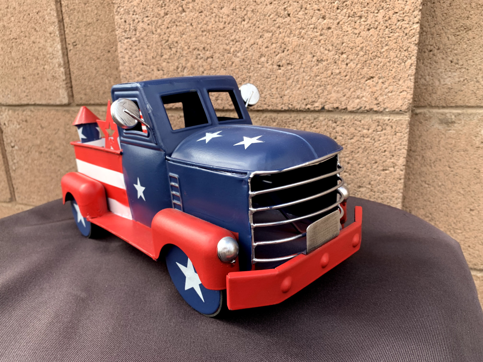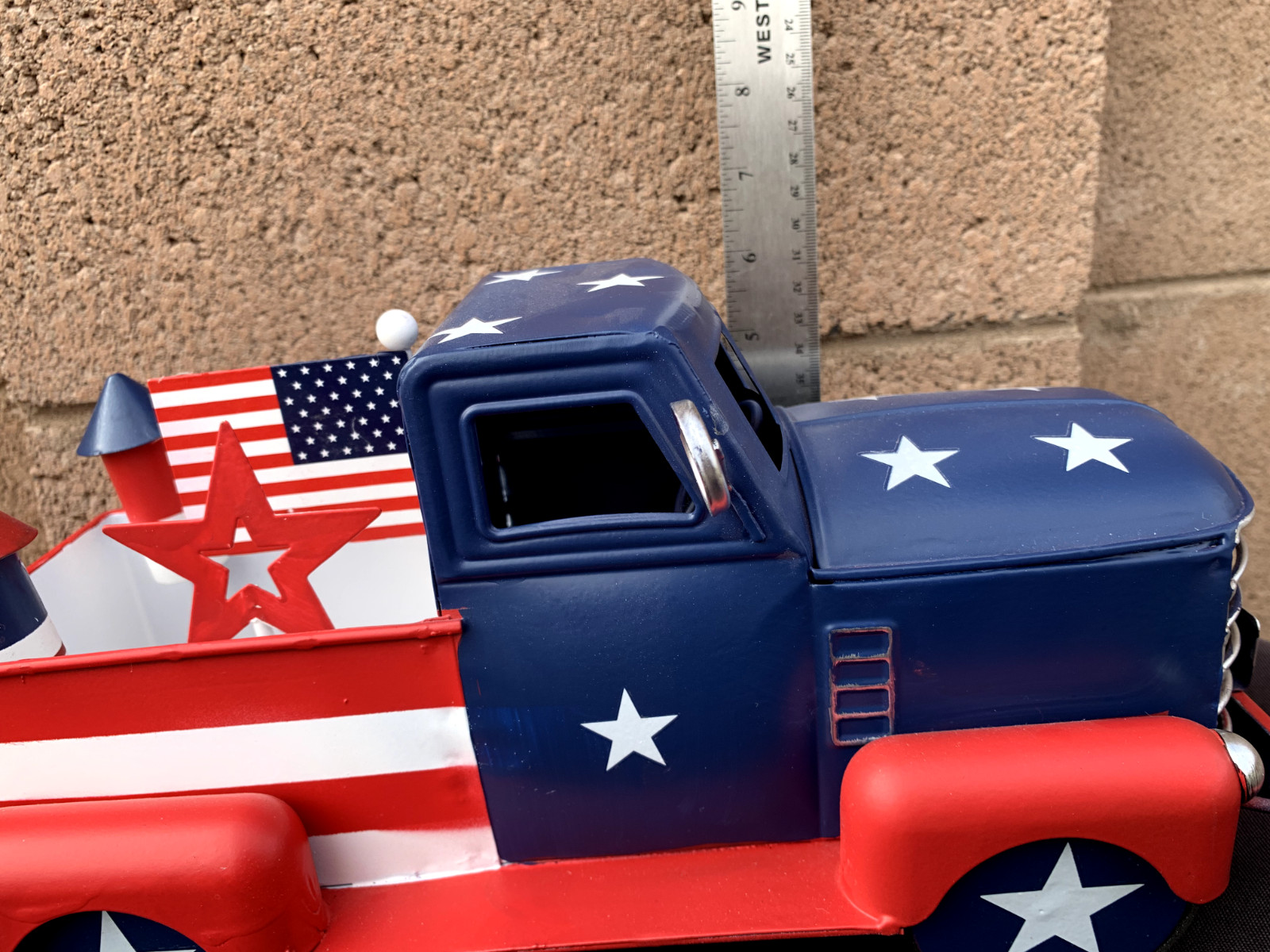 METAL FARMHOUSE TRUCK RED WHITE BLUE STAR FIREWORK FLAG PATRIOTIC 4TH JULY DECOR