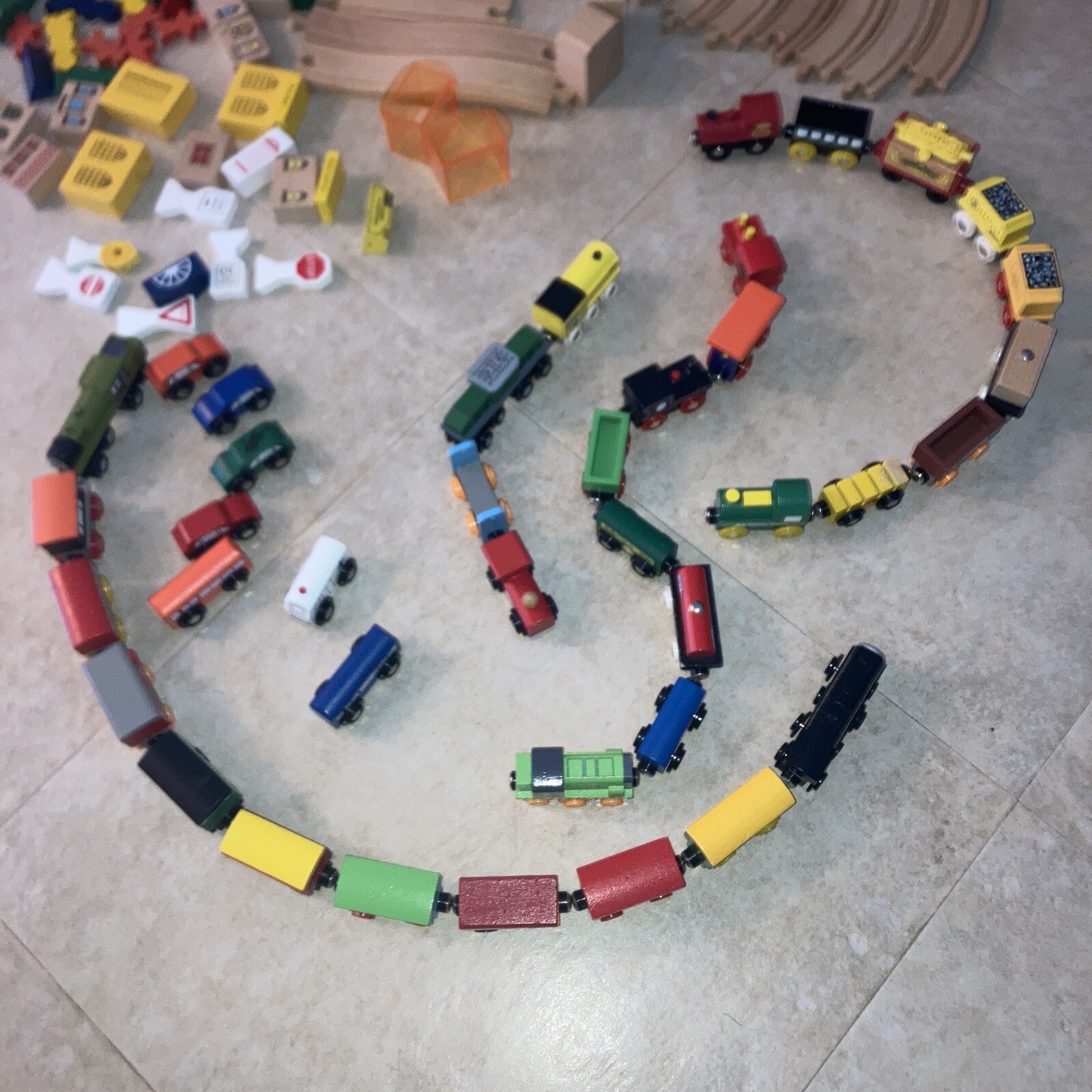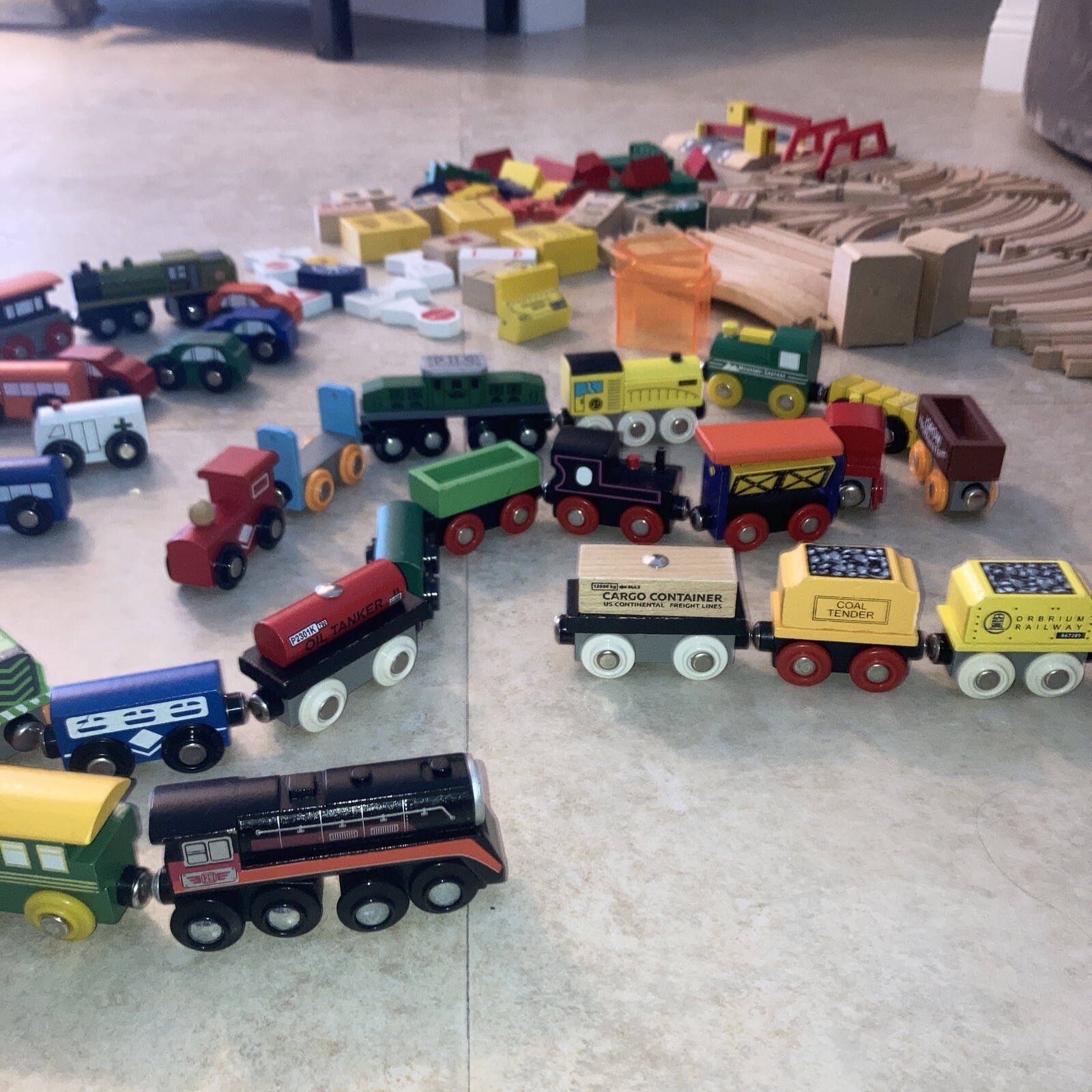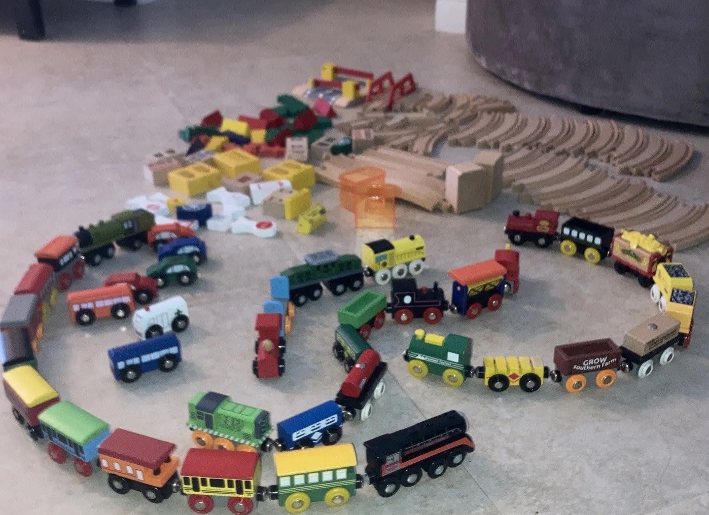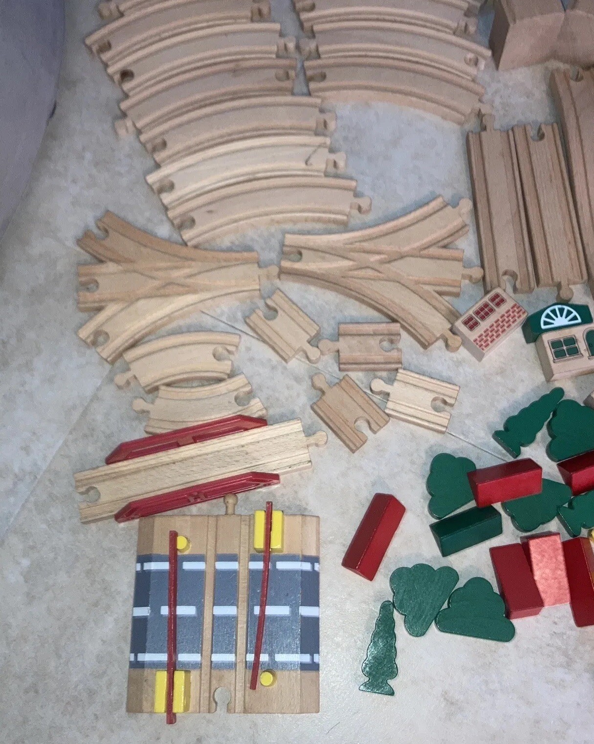 как выглядит Chuggington TOMY LOT Wooden Trains Set Magnetic Bridge Shops Trees 100 Piece фото