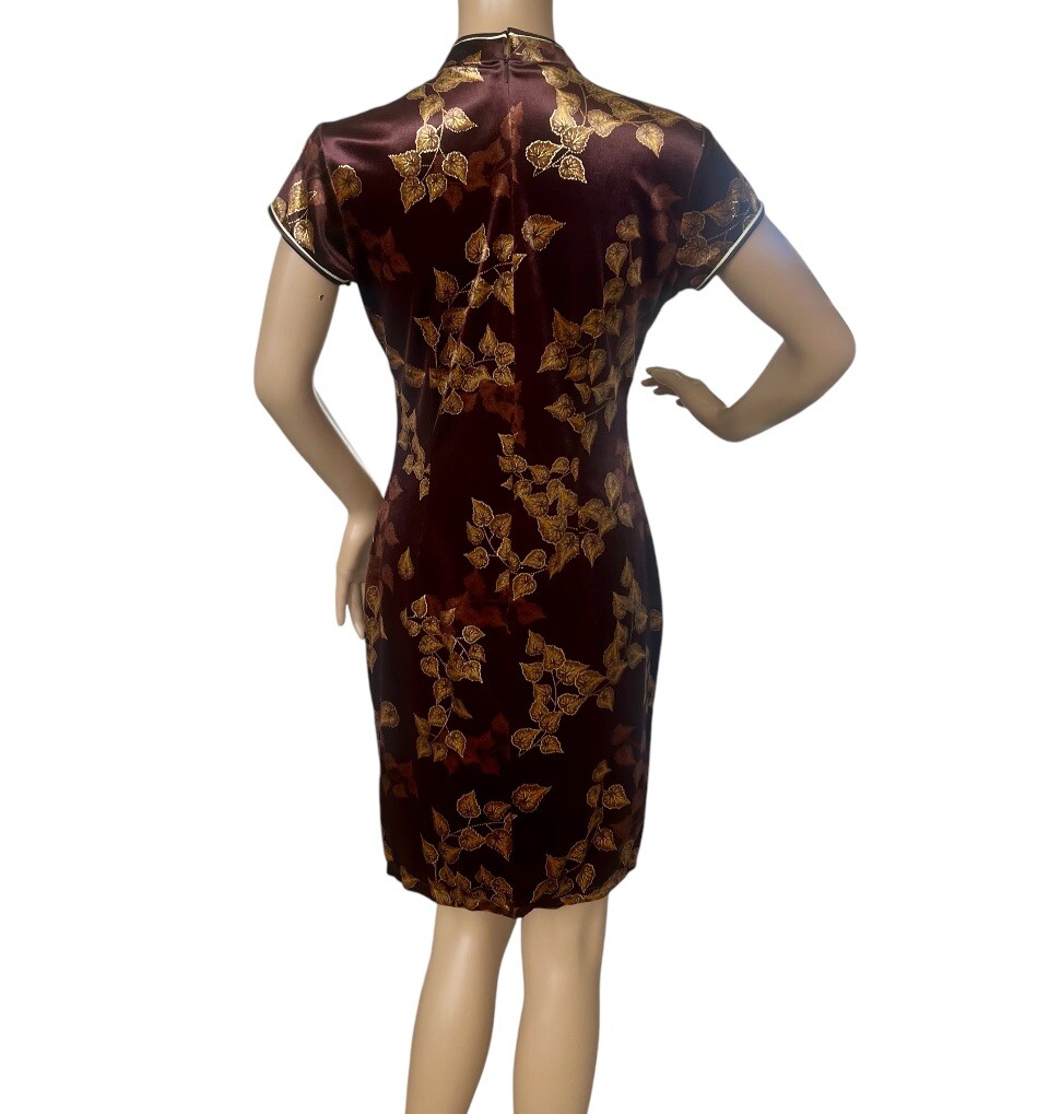Womens Chinese Cheongsam Dress Cap Sleeves Dark Plum/Gold Stretch Size M