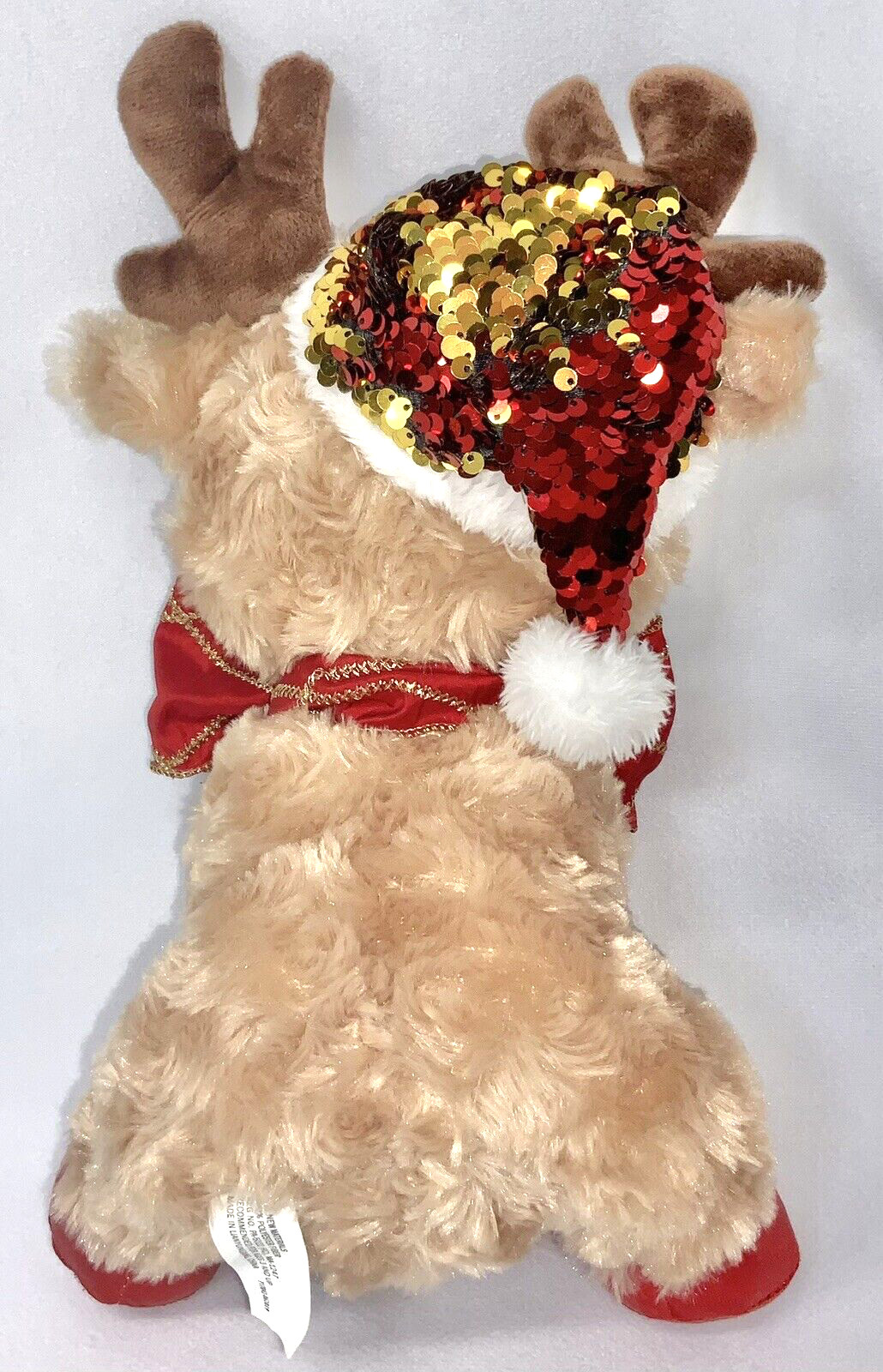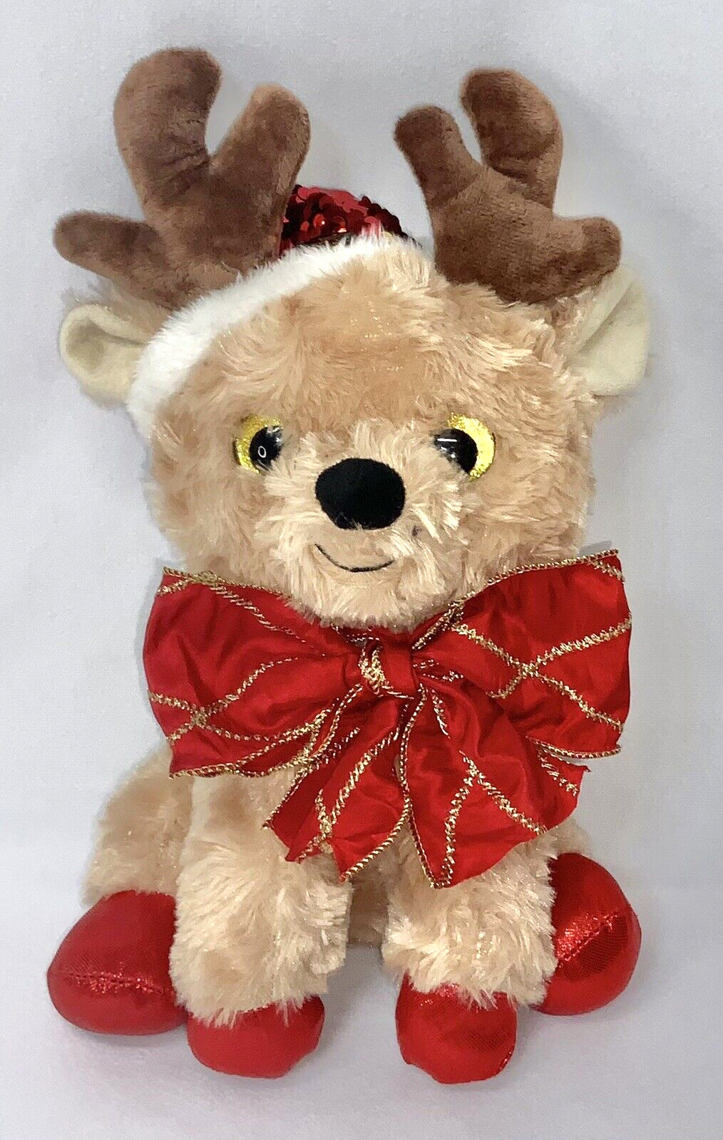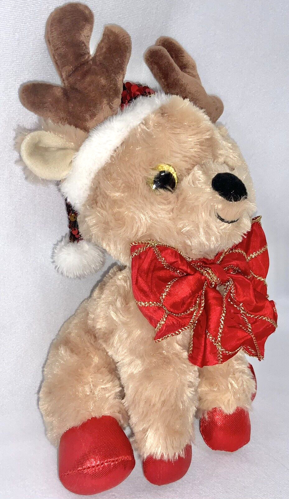 • Goffa- Christmas Big Eye Reindeer Plush Animal 11.5" Sequin Santa Hat Large Bow
