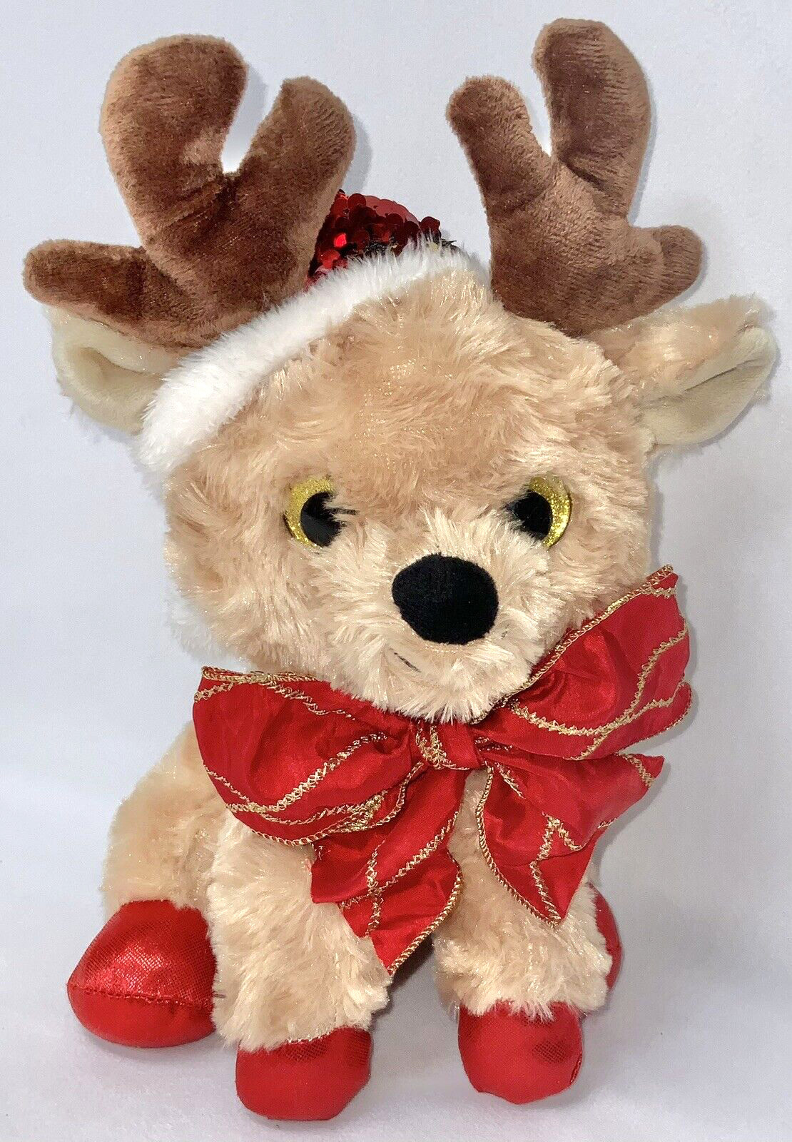 Goffa- Christmas Big Eye Reindeer Plush Animal 11.5" Sequin Santa Hat Large Bow
