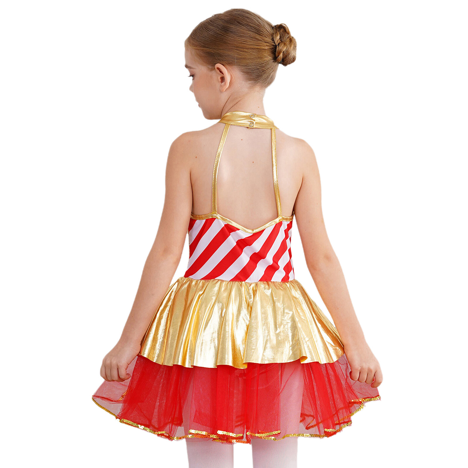 Kids Girls Christmas Dance Costume Sequins Striped Leotard Figure Skating Dress