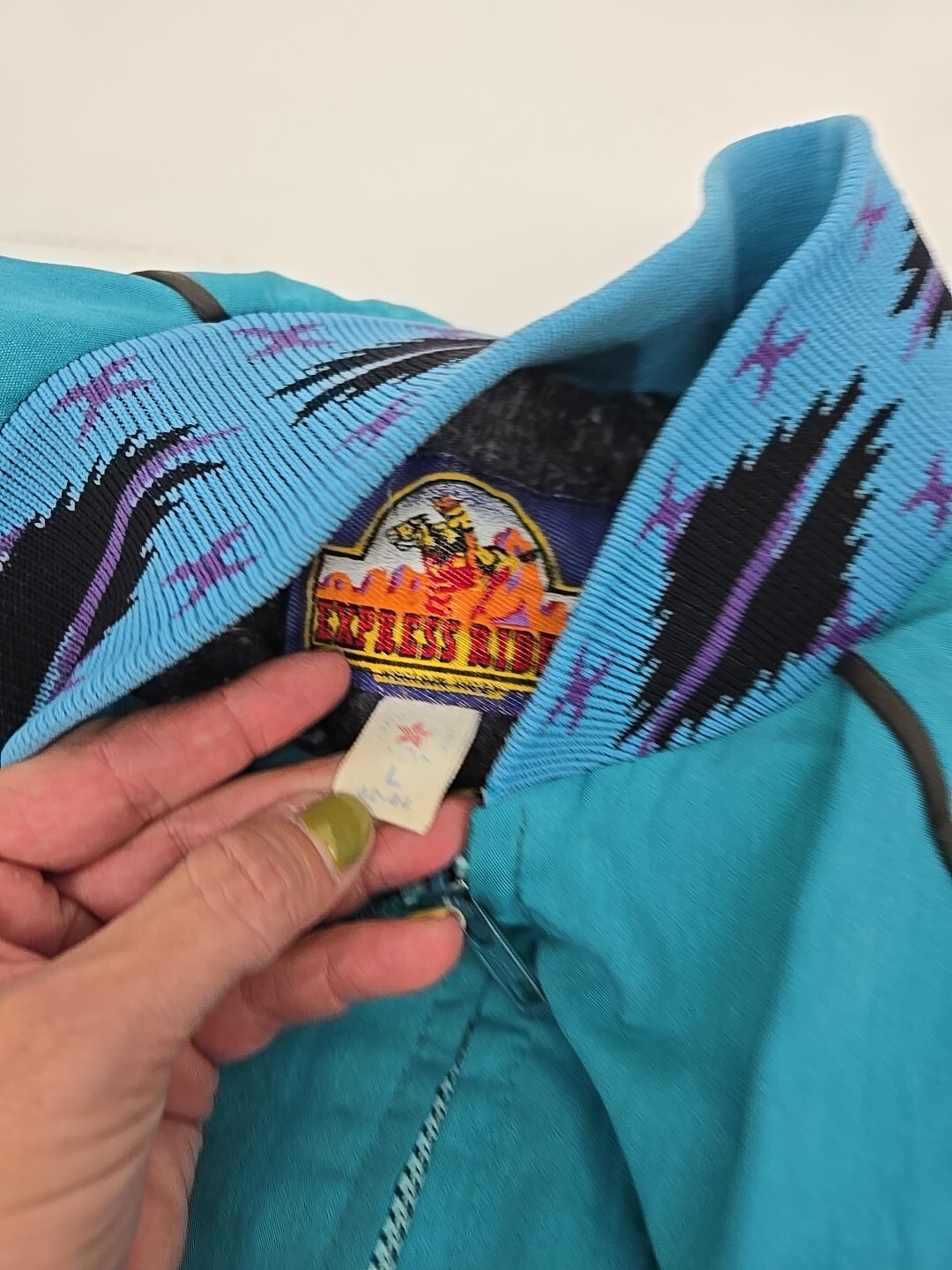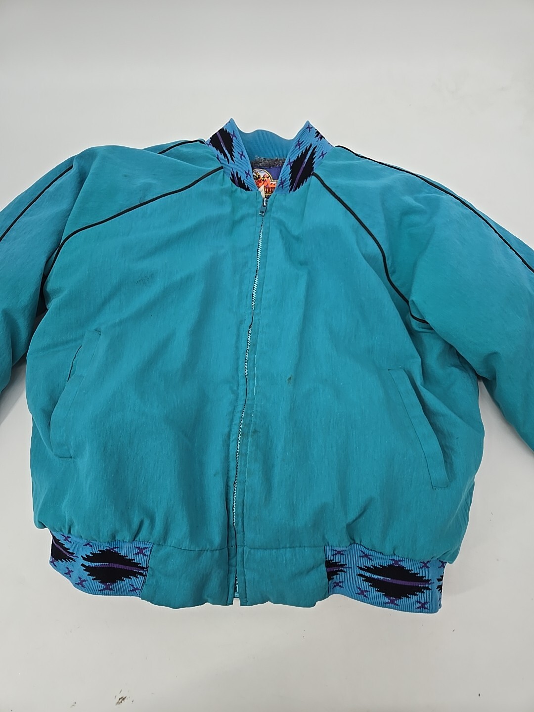 Vintage 80s Western Farm Jacket Teal, Faded Native Print, Large Retro Cowboy