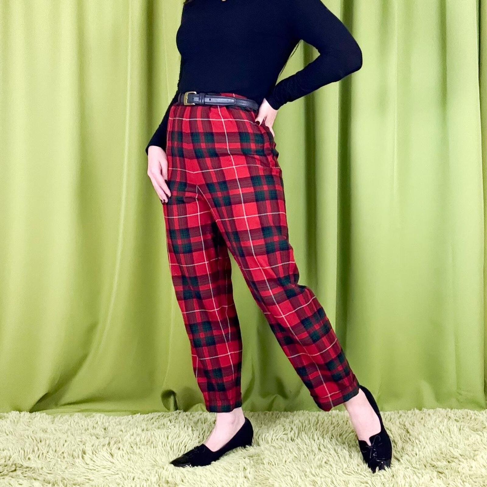 как выглядит 60s Vintage High-Waisted Red and Black Plaid Wool Pleated Trouser Pants фото