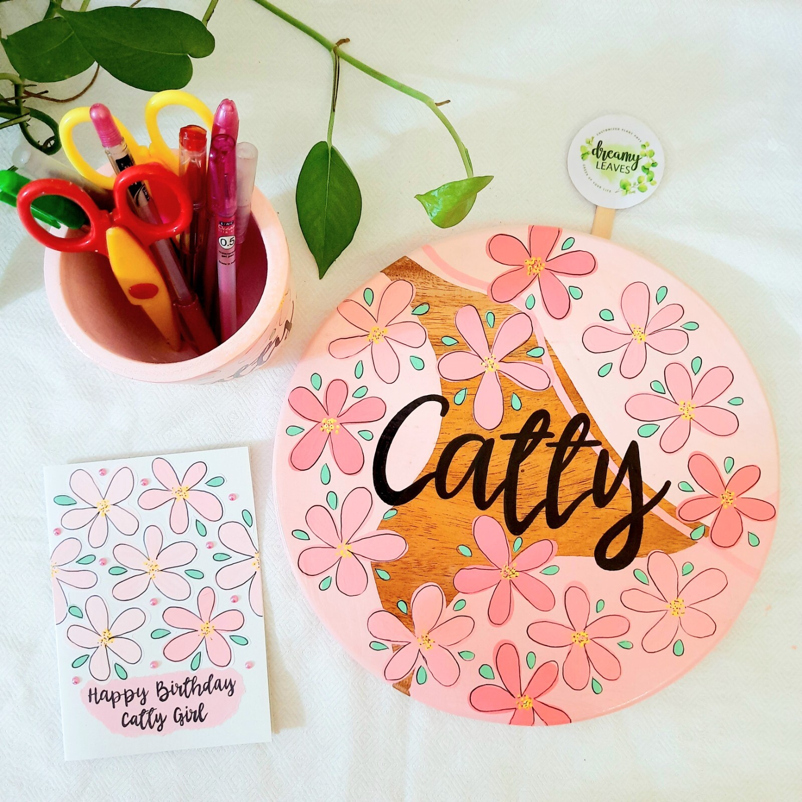 Includes: 1 x Handpainted Pen Holder + 1 x Wooden Board + 1 x Handmade Card