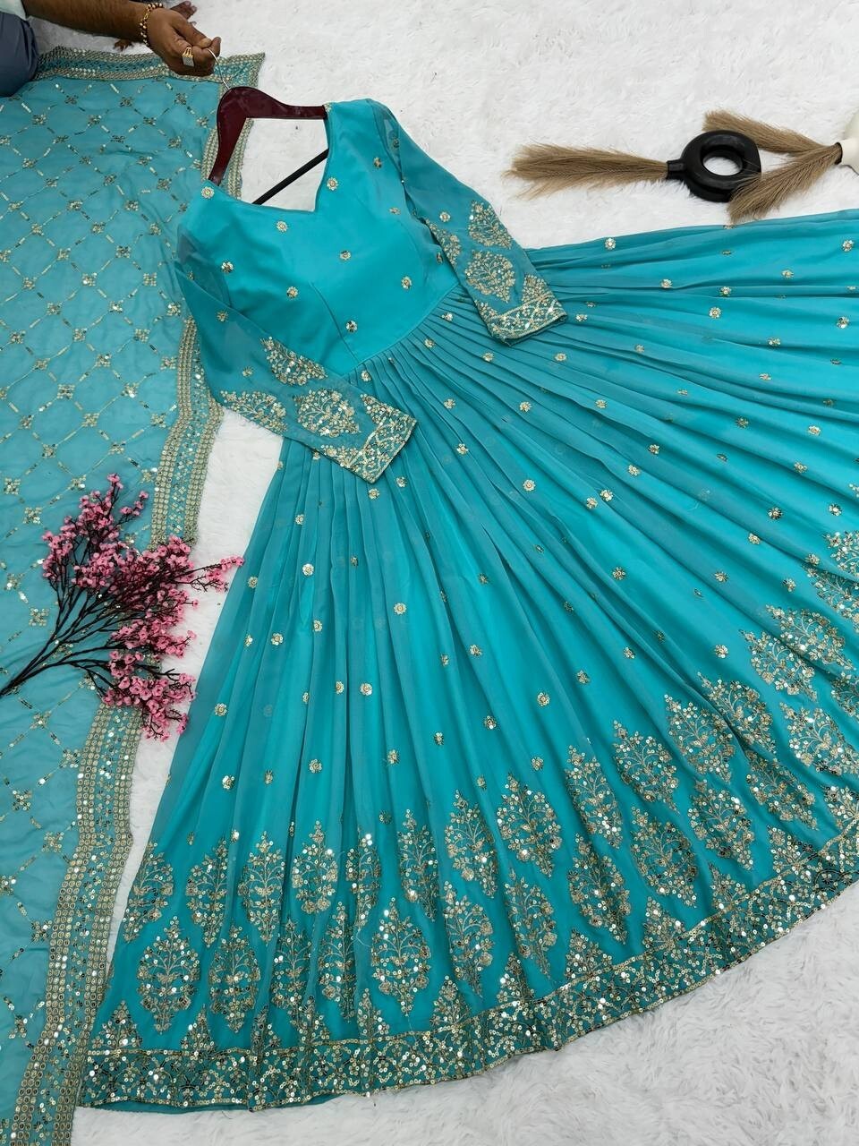 как выглядит New faux Georgette Sky Blue Gown With Stylish Dupatta For Women Party Wear фото