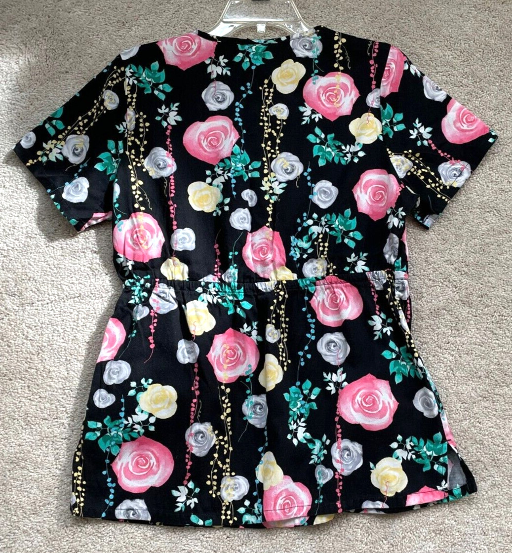 Cherokee Runway Black w/ Coral, Yellow, Gray Roses Vine Scrub Top Women's M
