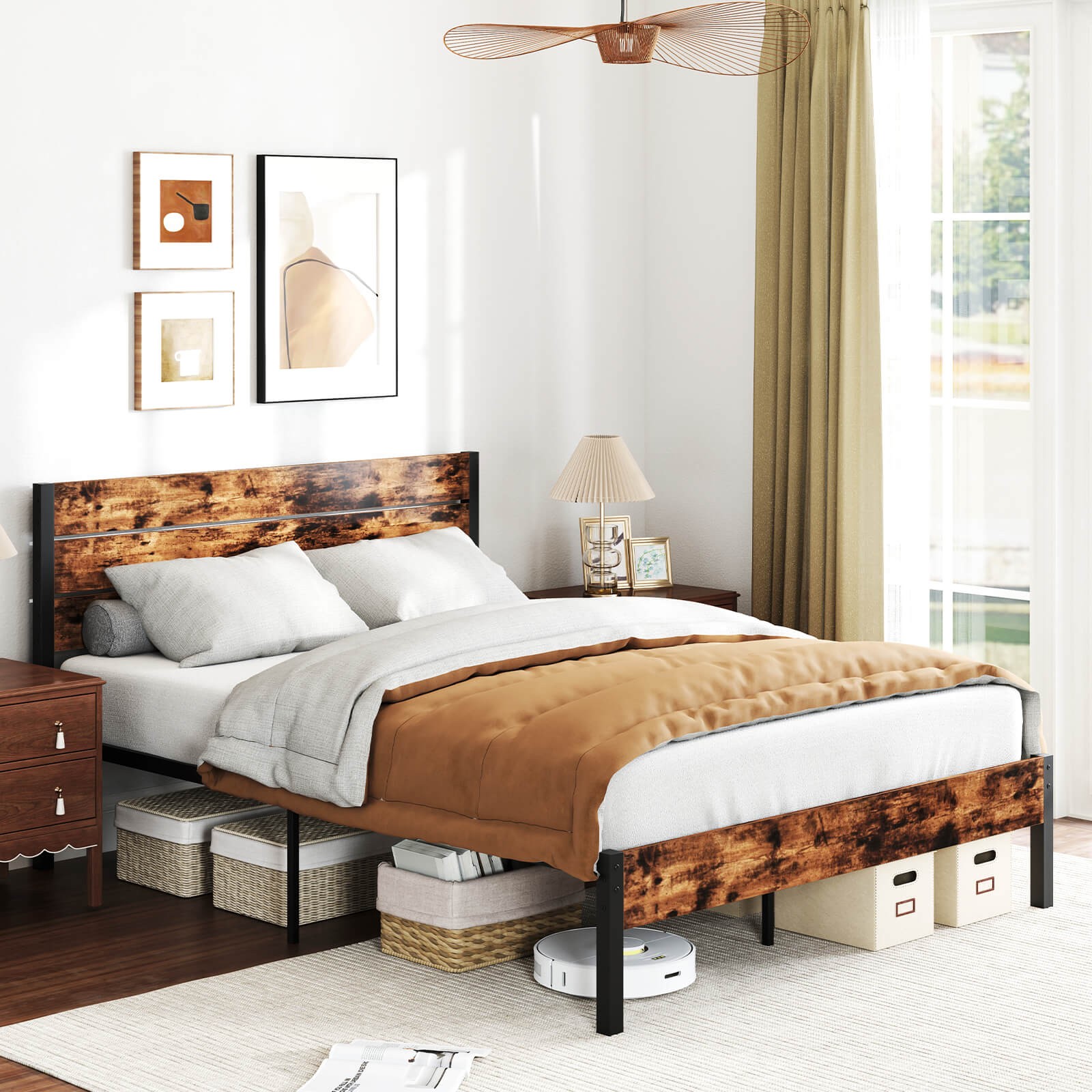 Queen Bed Frame w/ Tall Industrial Headboard Heavy-Duty Metal Slats Support