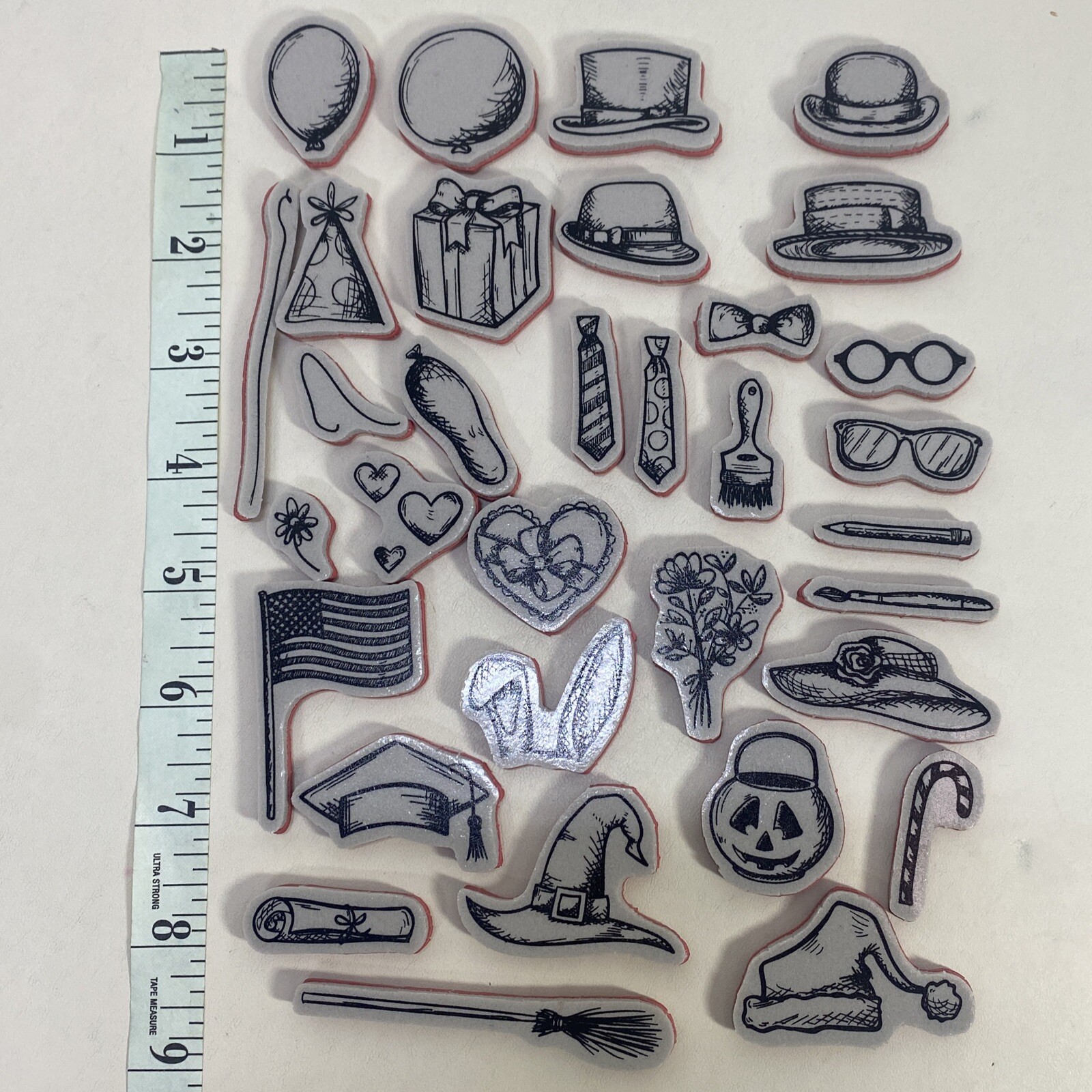 как выглядит Sizzix Tim Holtz Crazy Things Stamp Set-Hats Flag Glasses Ballons-Retired фото