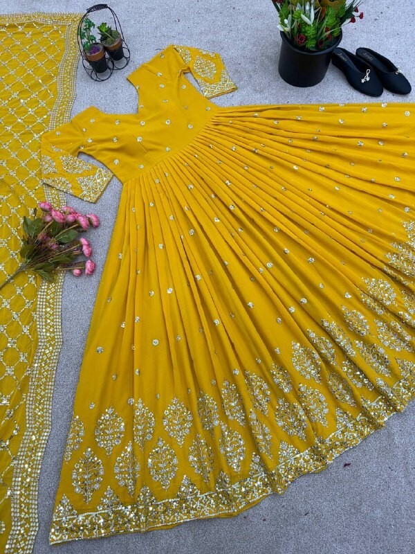 как выглядит YELLOW COLOR FAUX GEORGETTE GOWN WITH DESIGNER DUPATTA FOR WEDDING WEAR фото