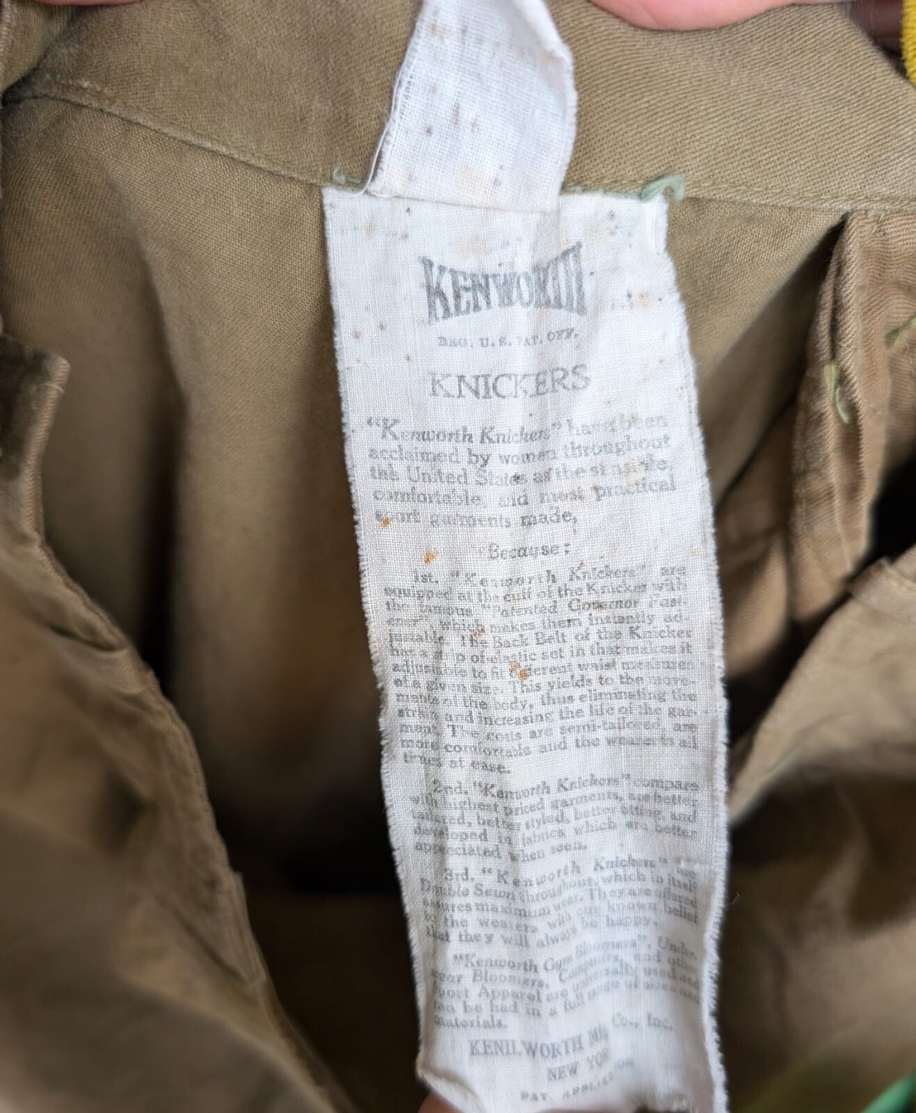 ANTIQUE 1920 S SPORTING KNICKERS PANTS W HOOK GROMMET CLOSING LEGS LABEL