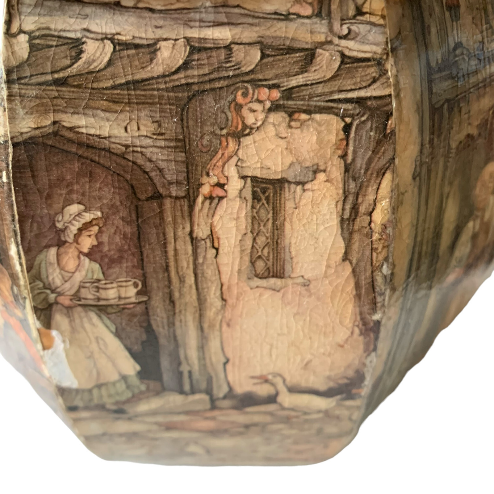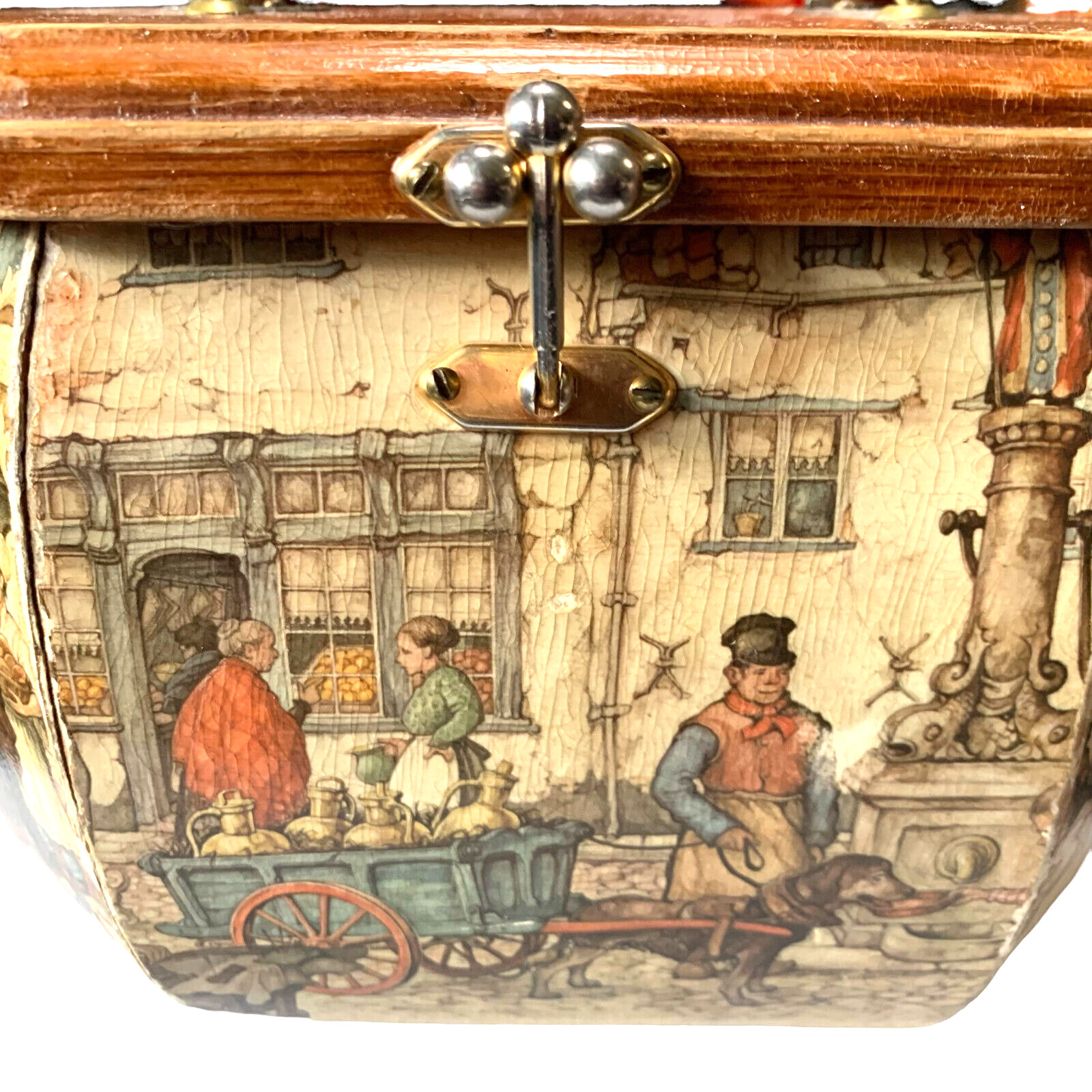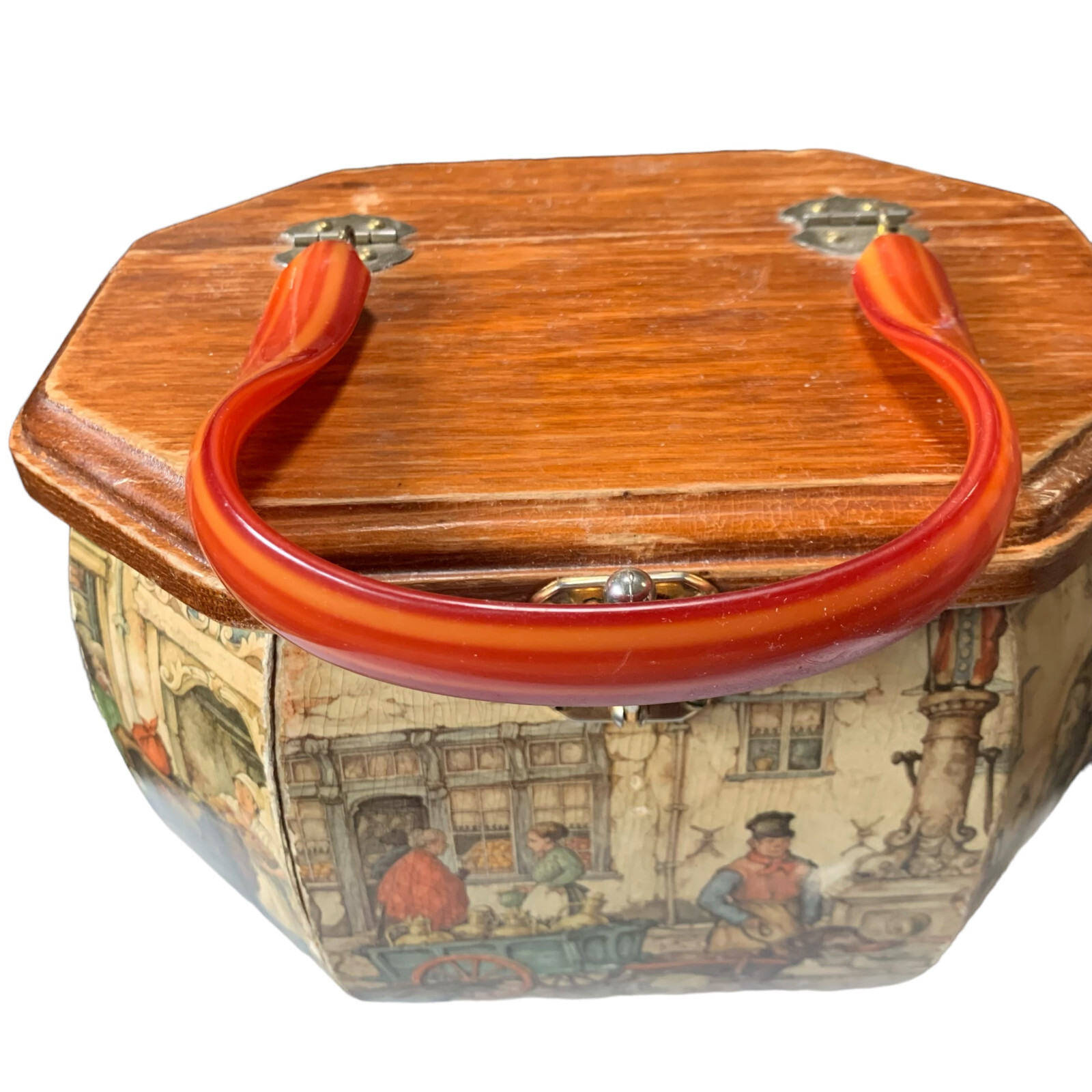 как выглядит Vintage Anton Pieck Decoupage Wood Box Purse Bakelite Handle Town Market Scene фото