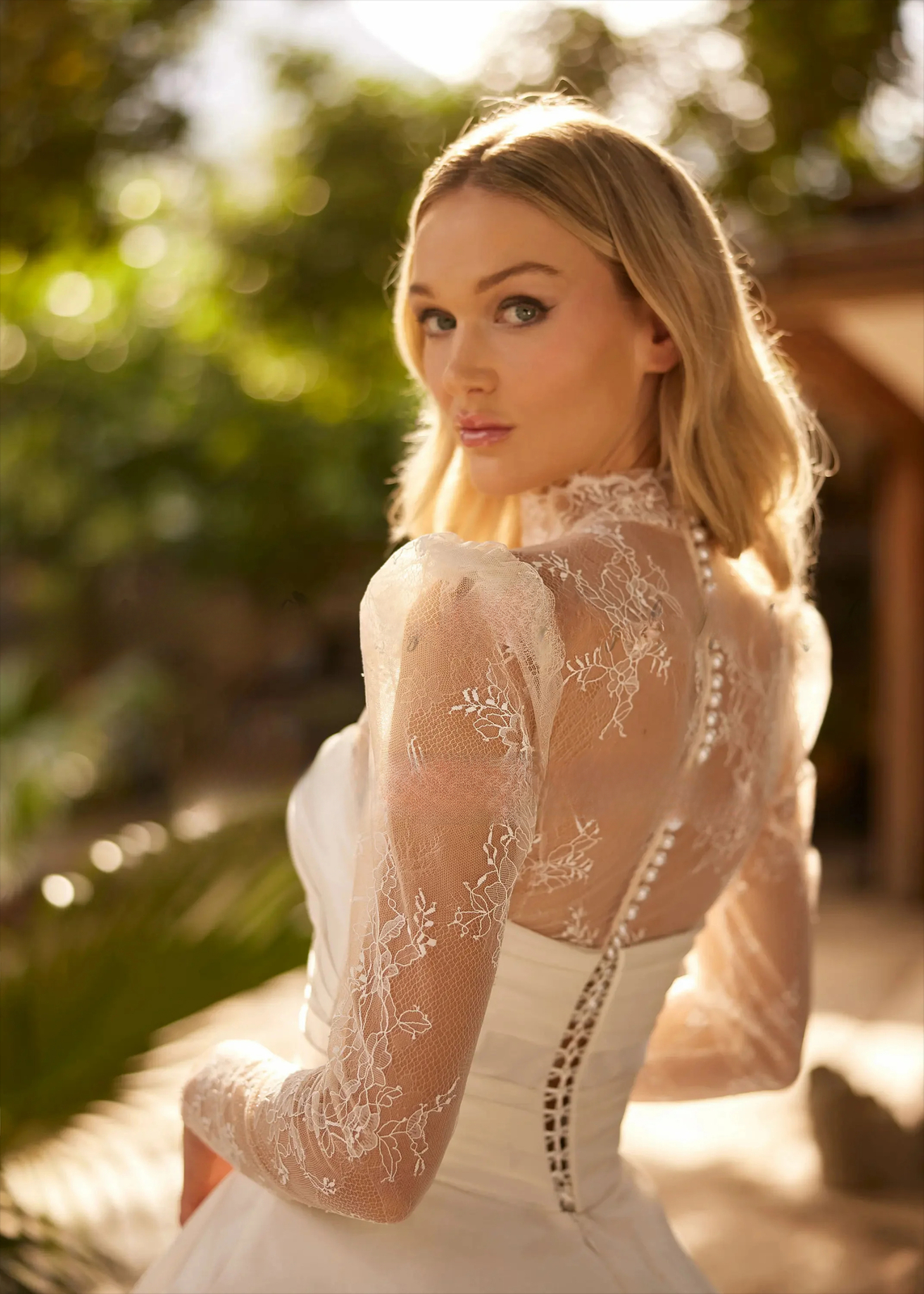 как выглядит High-neck satin Wedding Dress with Long Sleeves, Buttoned Bridal Gown Train HOT фото