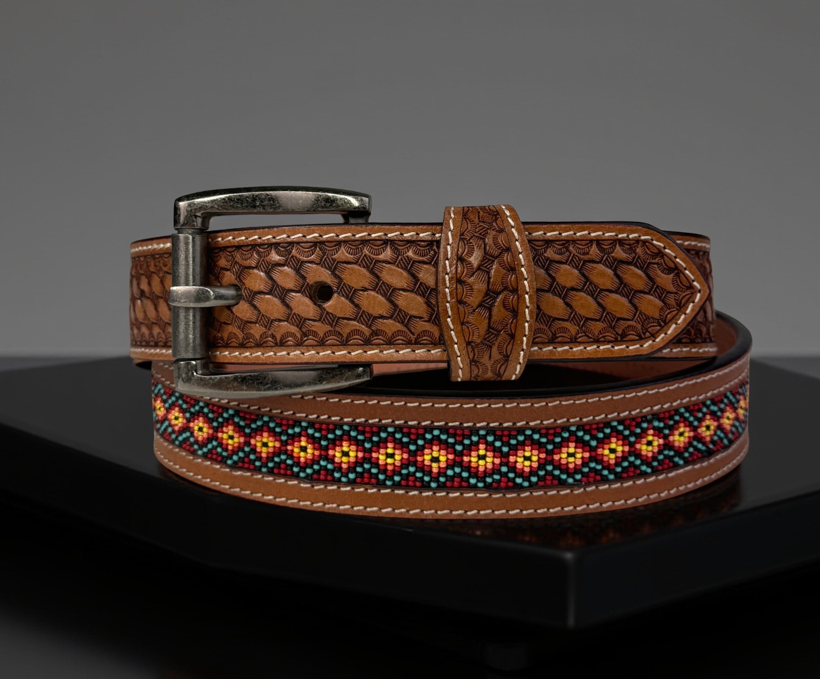 Beaded Western Belt Cowboy Rodeo Full Grain Leather Hand Tooled Removable Buckle