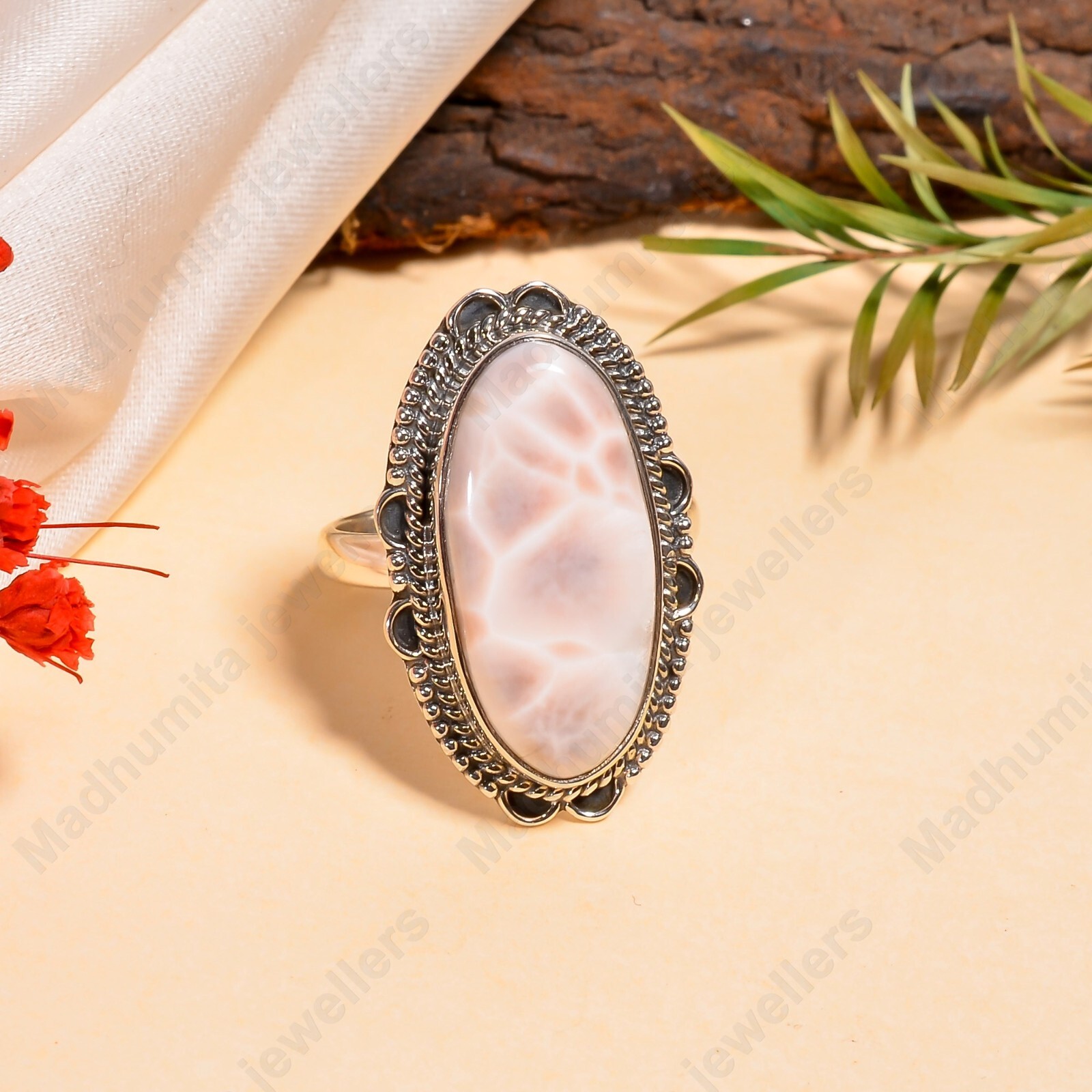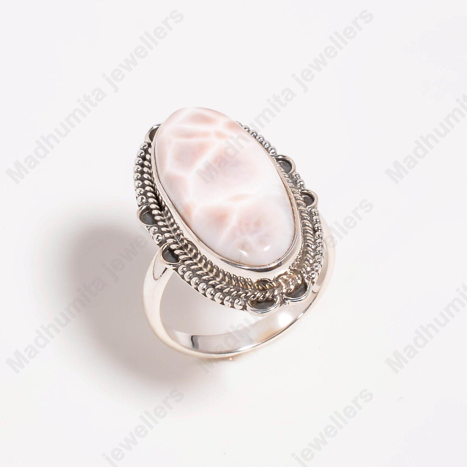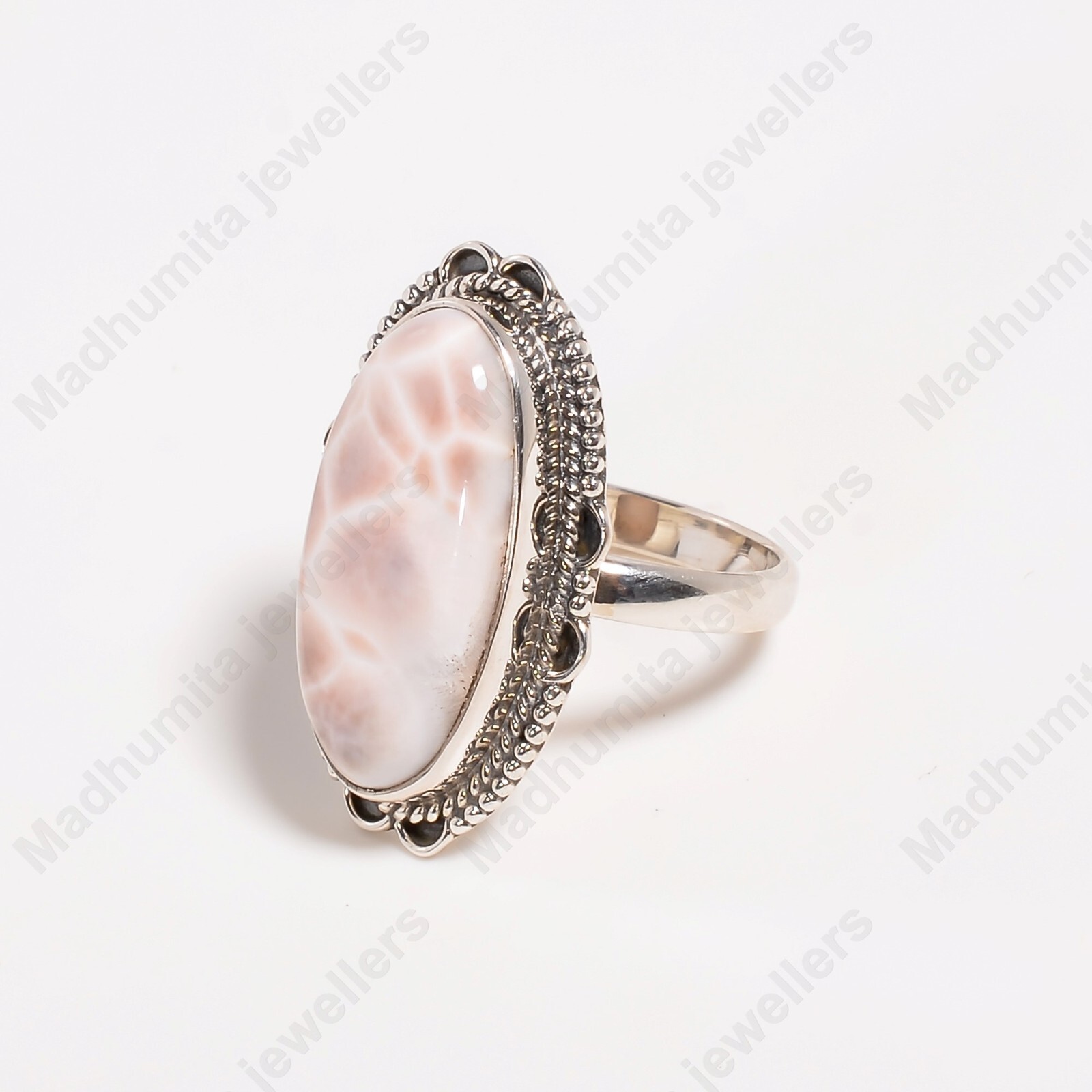 как выглядит Pink Larimar Gemstone Handmade 925 Sterling Silver Natrolite Ring Statement Ring фото