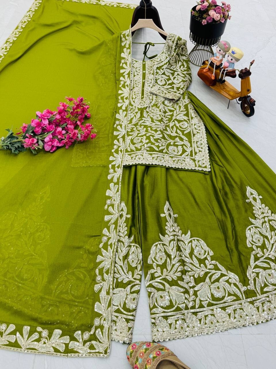 Presenting New Chinon Silk Olive Green Top Palazzo And Dupatta For Engagement