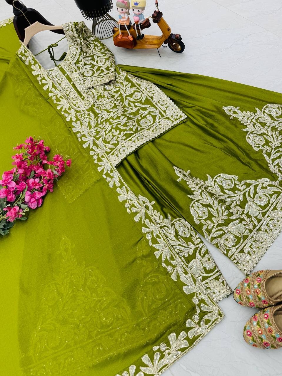 как выглядит Presenting New Chinon Silk Olive Green Top Palazzo And Dupatta For Engagement фото