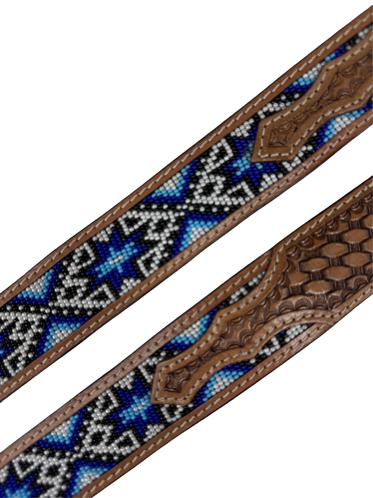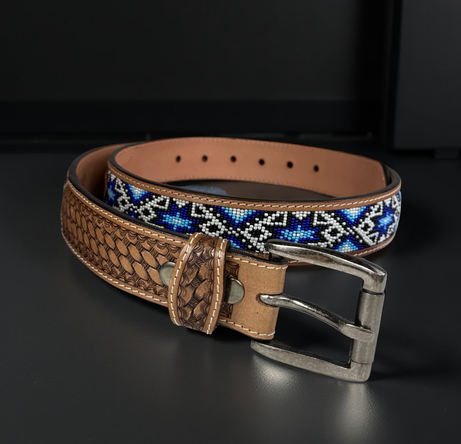 Beaded Western Belt Cowboy Rodeo Full Grain Leather Hand Tooled Removable Buckle