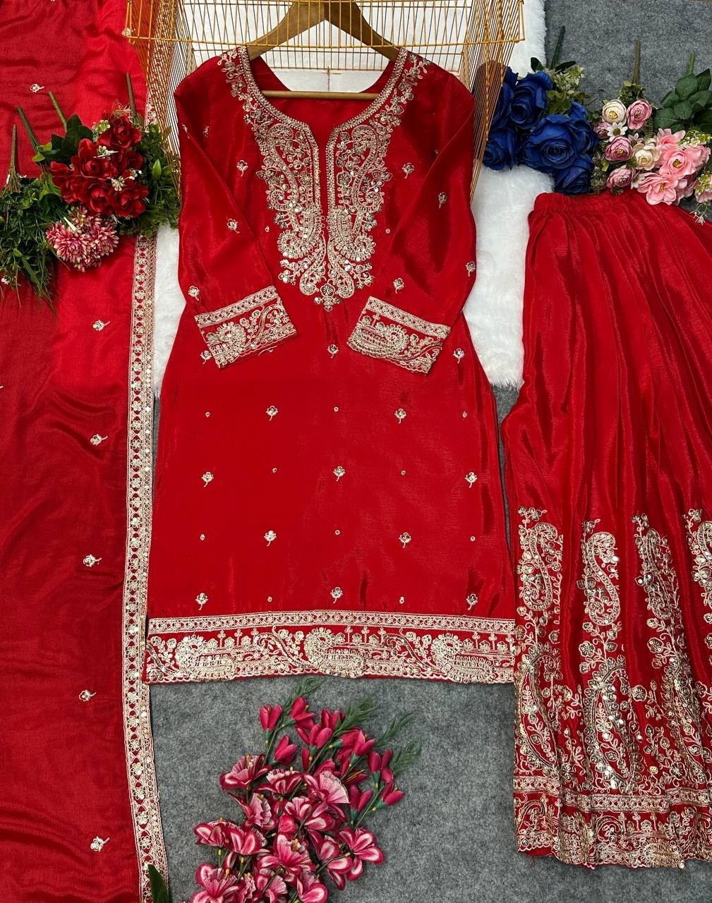 как выглядит Party Wear Chinon Silk Red Kurta Palazzo With Fancy Dupatta For Women фото