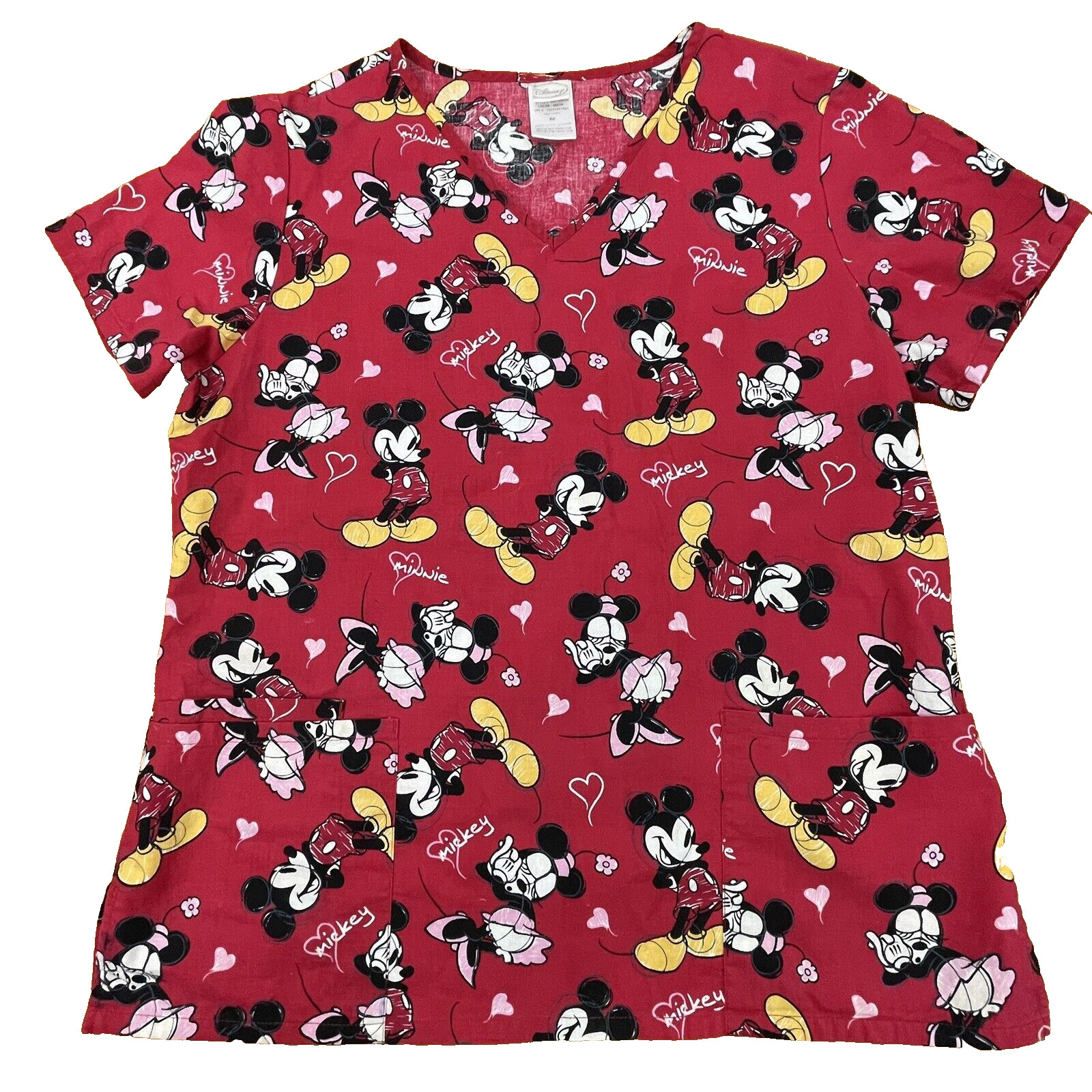 Disney Mickey and Minnie Mouse Womens Scrub Top Medium Front Pockets Red