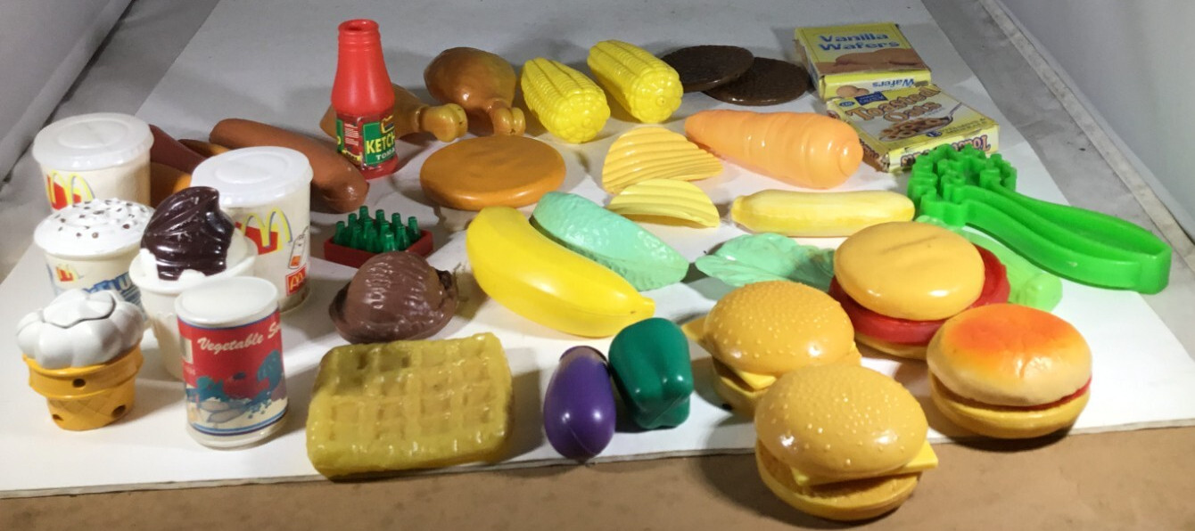 Lot of assorted pretend play food with plastic container - pre-owned