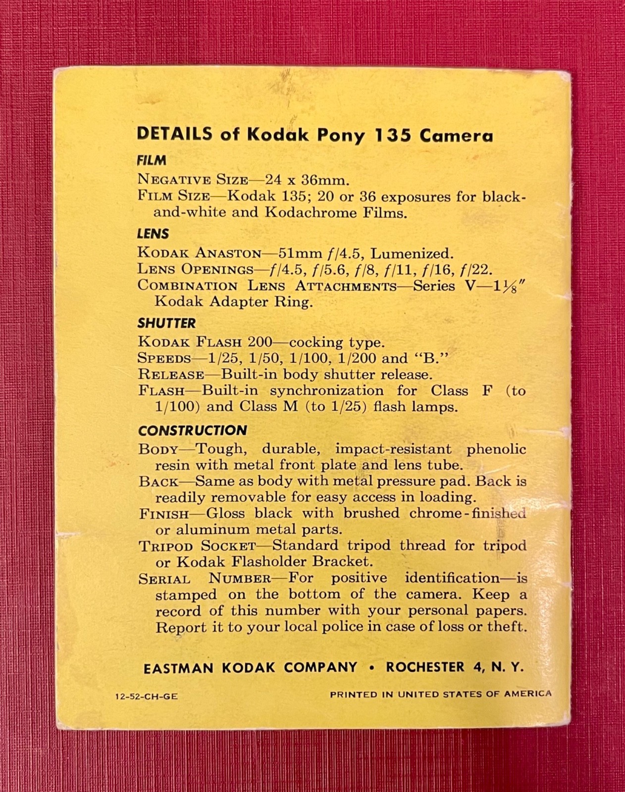 Vintage 1950s Kodak Pony 135 35mm Camera Instruction Manual