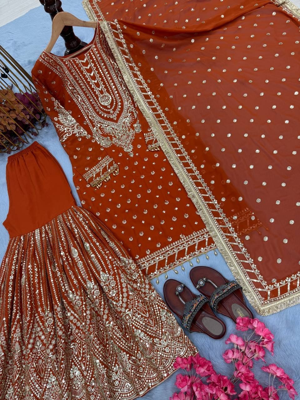 как выглядит New Launching Faux Georgette Orange Kurta Palazzo With Dupatta For Reception фото