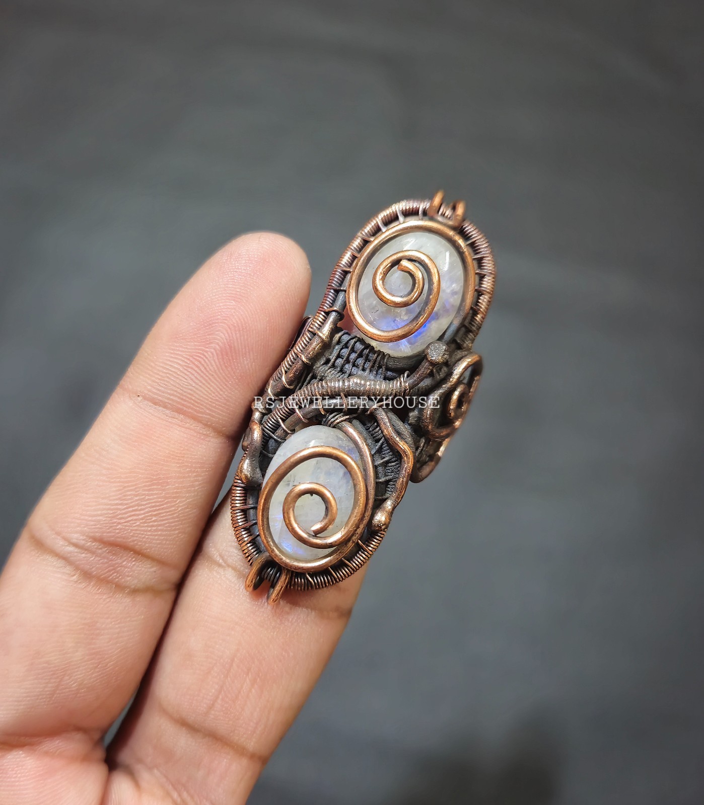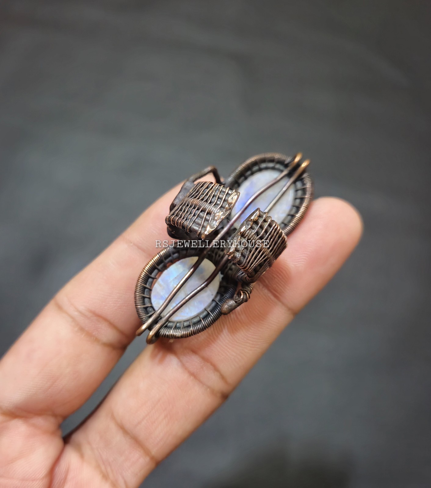 как выглядит Rainbow Moonstone Ring Copper Wire Wrapped Ring Adjustable Ring Handmade Ring фото