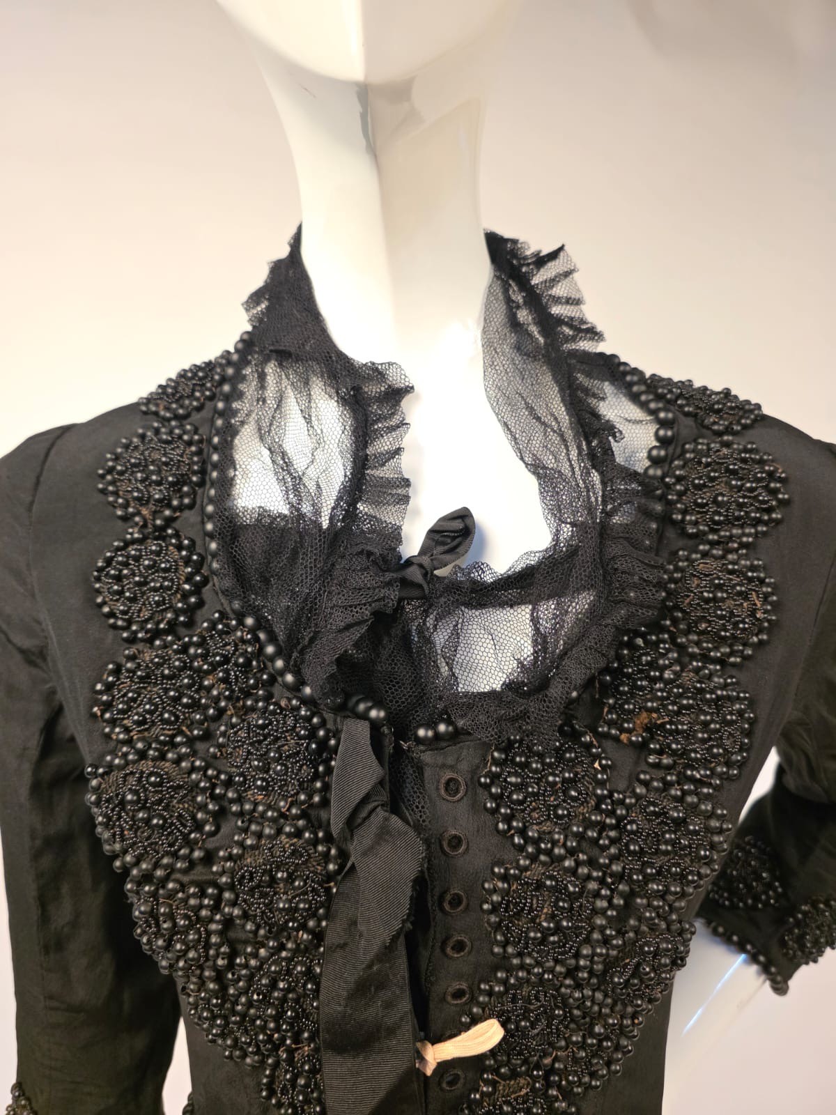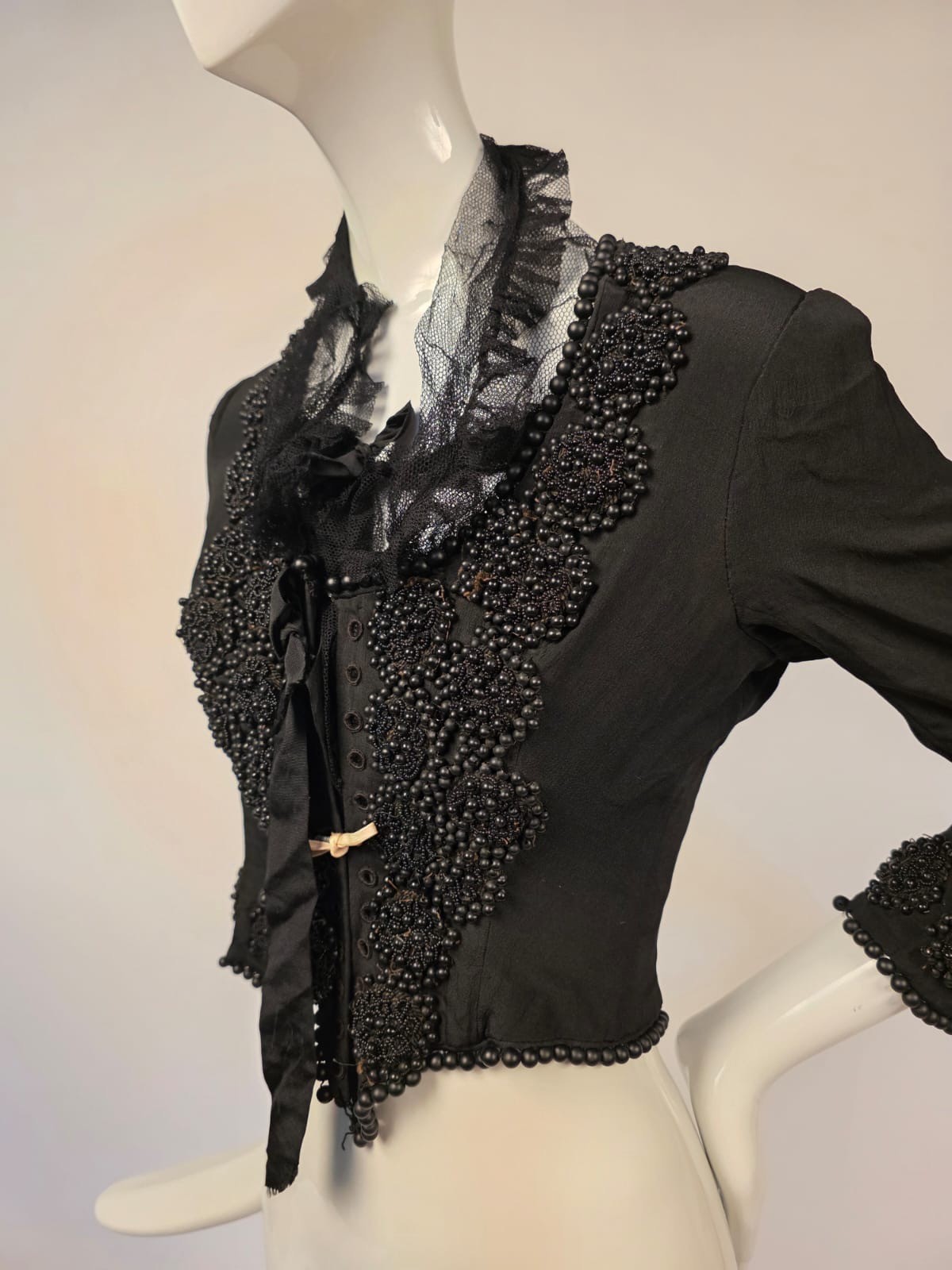 как выглядит VICTORIAN 1890 S BLACK SILK BODICE W BUBBLE GLASS BEADING CORSET LACING FRONT фото