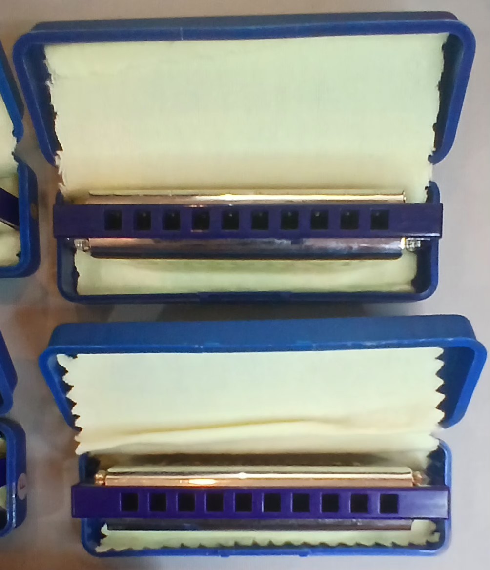 как выглядит 5x JAMBONE BY AXL. KEYS OF A, D, E, F, G TEN HOLE HARMONICAS in Cases фото