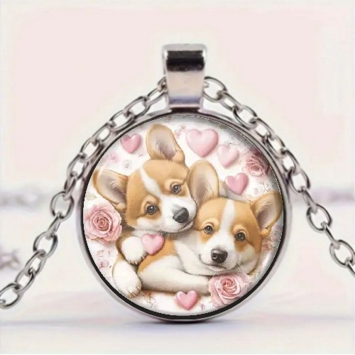 как выглядит Puppy With Pink Roses Hearts Round Glass Pendant Necklace фото