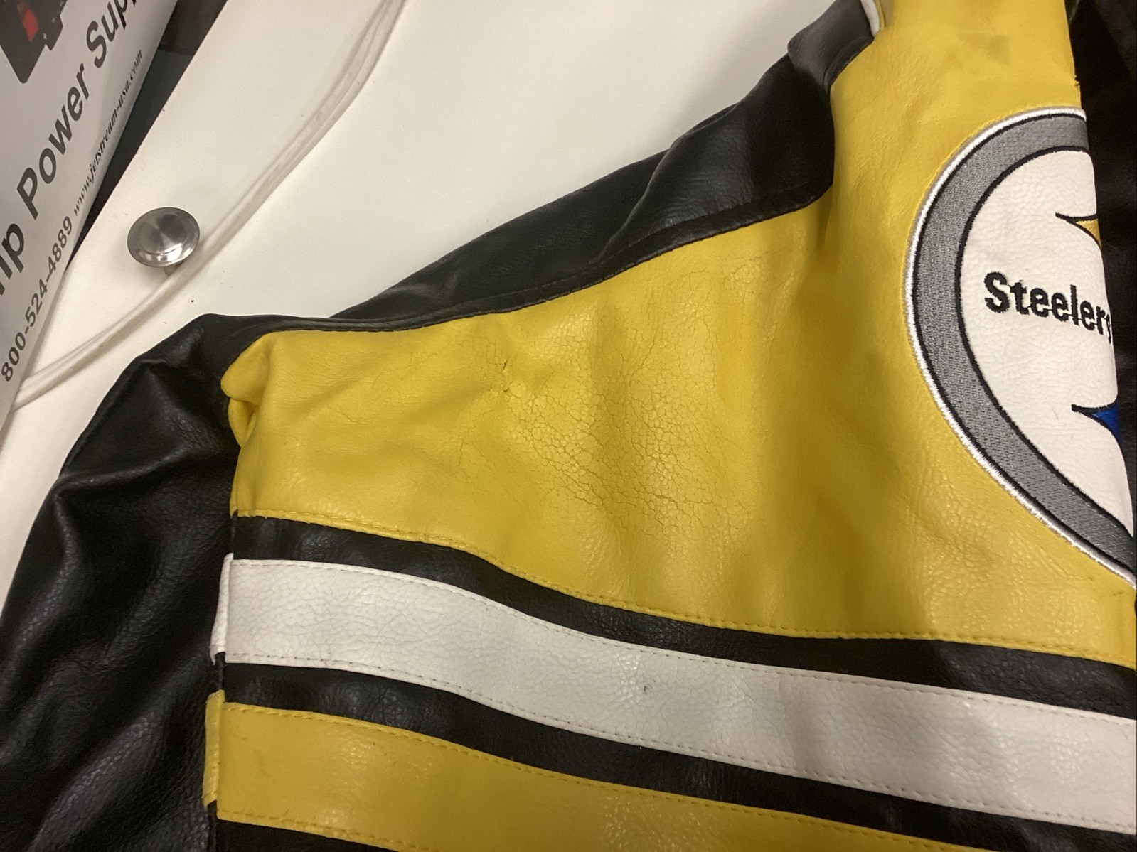 как выглядит Pittsburgh Steelers Bomber Jacket Faux Leather Vintage Logo Girder NFL Size XL фото