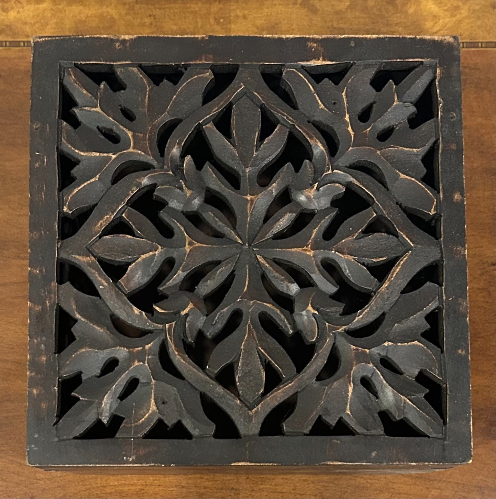 • Wooden Home Decor Square Box With Design Carved Lid Good Condition