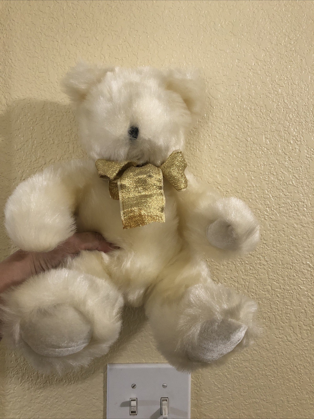 как выглядит Vintage Teddy Bear Fuzzy Fancy White With Golden Bow Rare фото