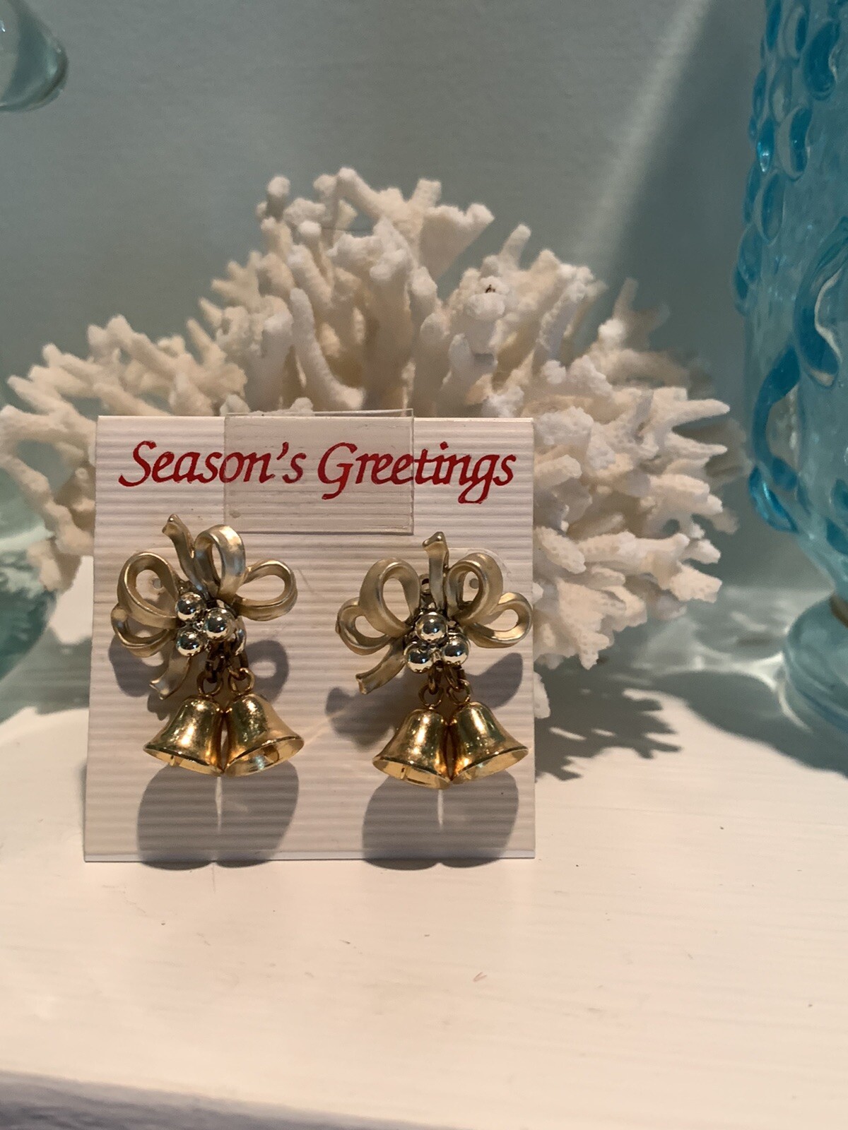 как выглядит Christmas Jingle Bells Post Earrings Gold Tone Bow Bells фото