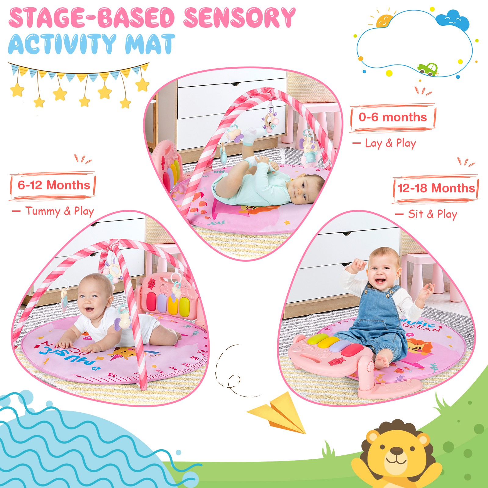 Baby Gym Baby Play Mat Kick and Play Piano Gym w/ 5 Hanging Sensory Toys Pink