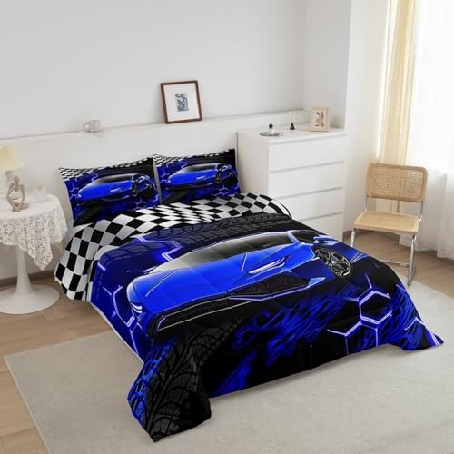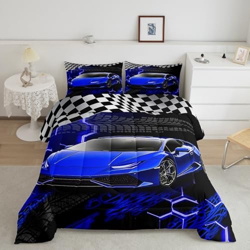 Racing Car Bedding Set for Kids, Boys, Girls - Size Speed Queen Blue and Black