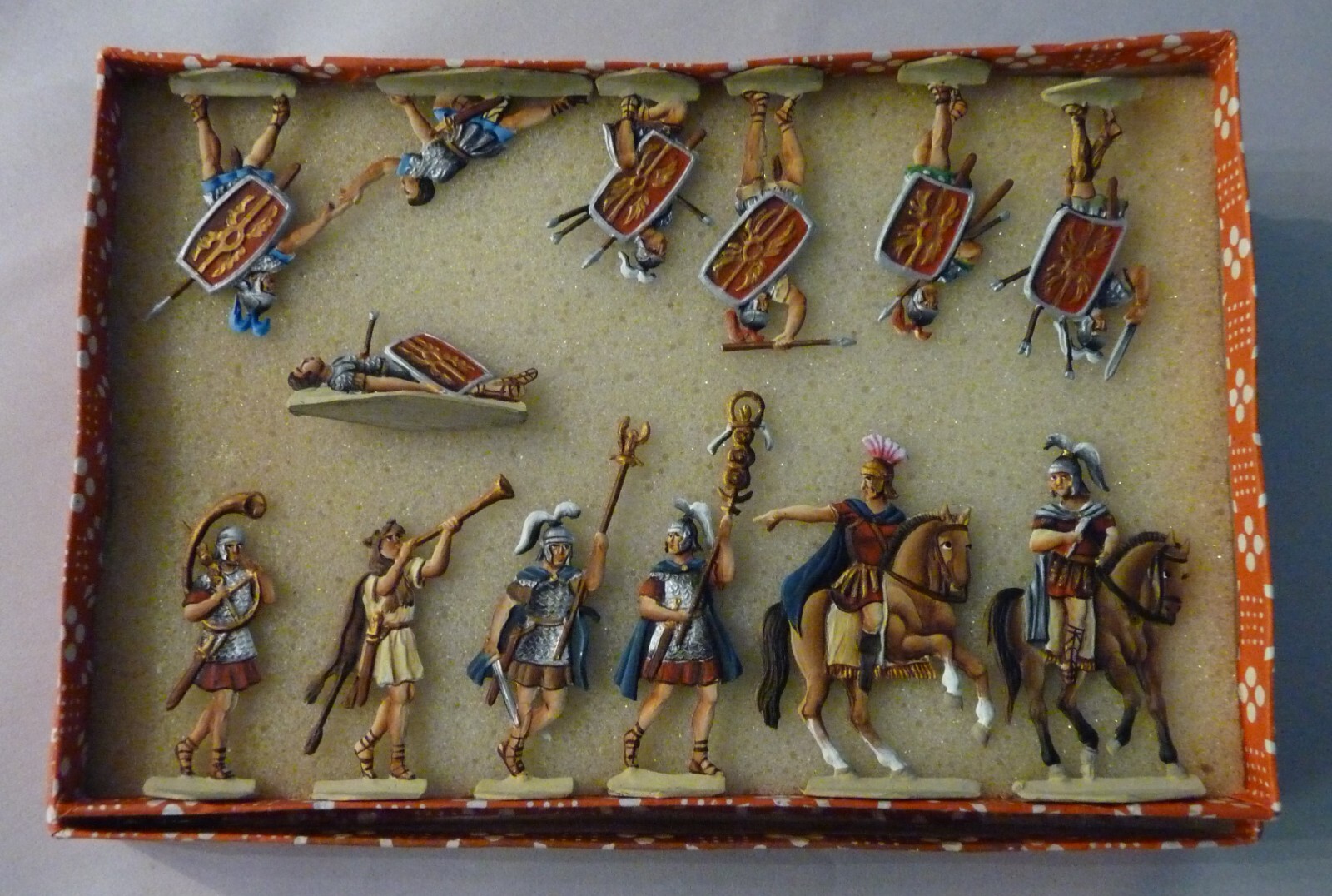 13, 1 1/2 Tall Zinnfiguren Roman Legionaries Set, Painted, Flats, Germany.
