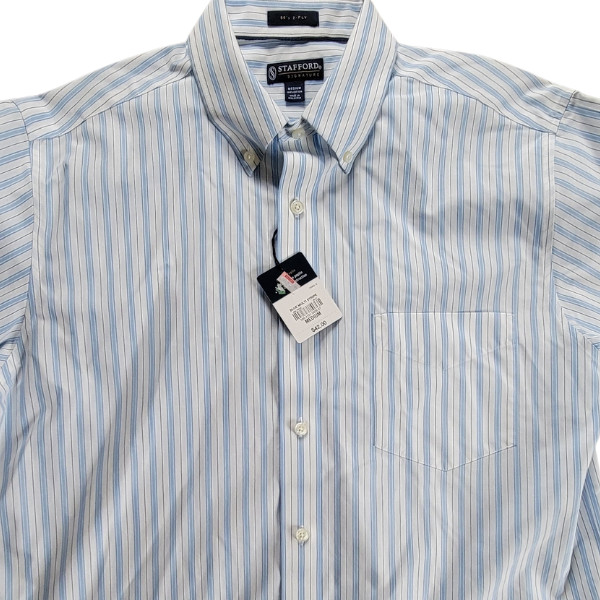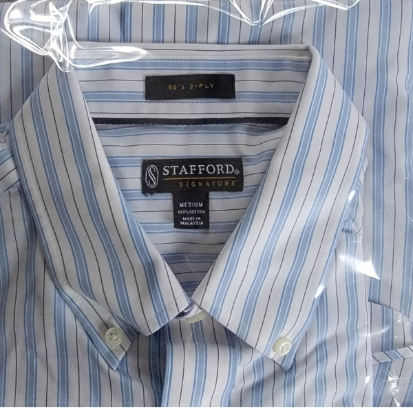 как выглядит Stafford Signature Mens Dress S/S Shirt Stripe MEDIUM 100 Cotton NWT----4042 фото
