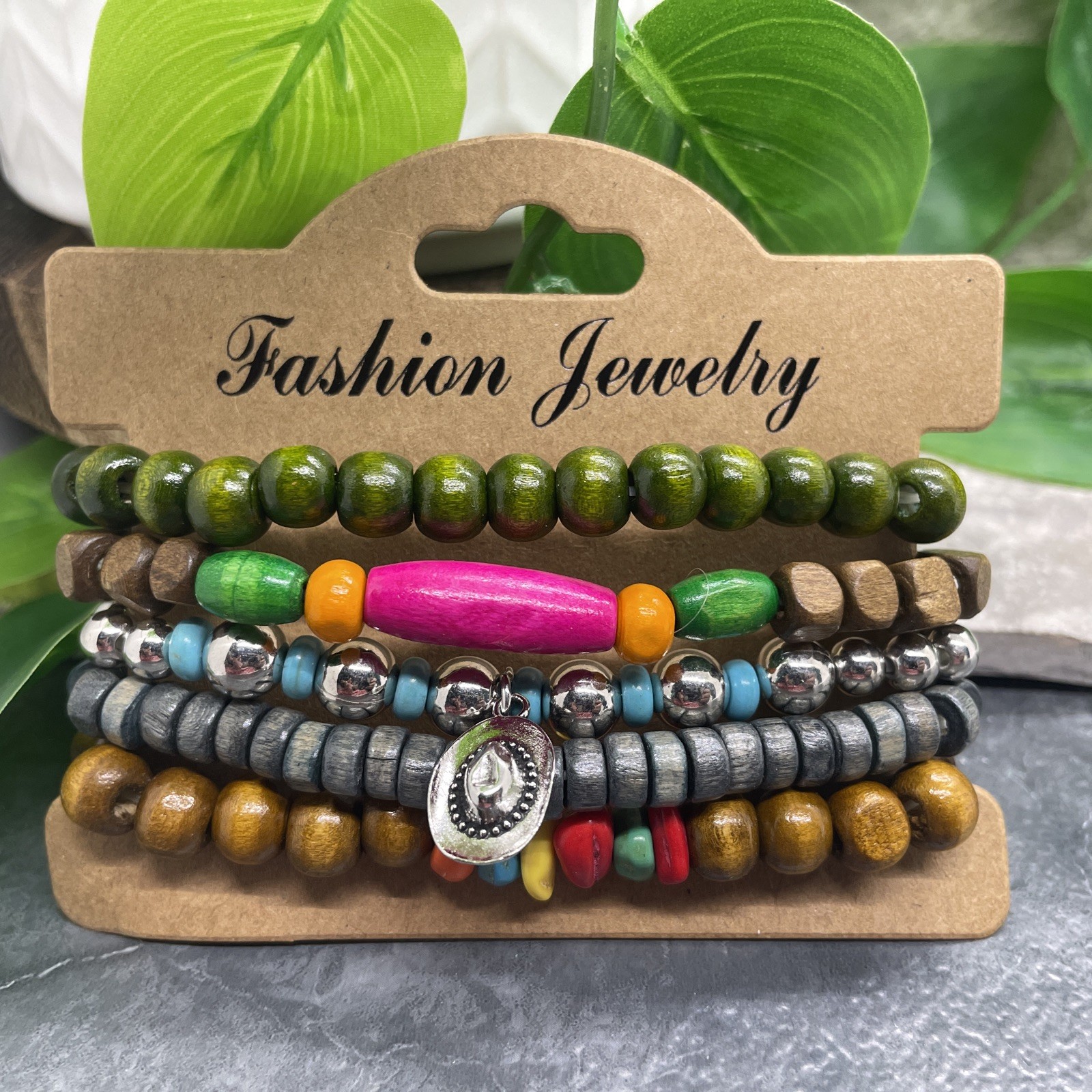 5 PC Handmade Boho Wood Bead Stackable 7 Plus Stretch Charm Bracelet Set B8400