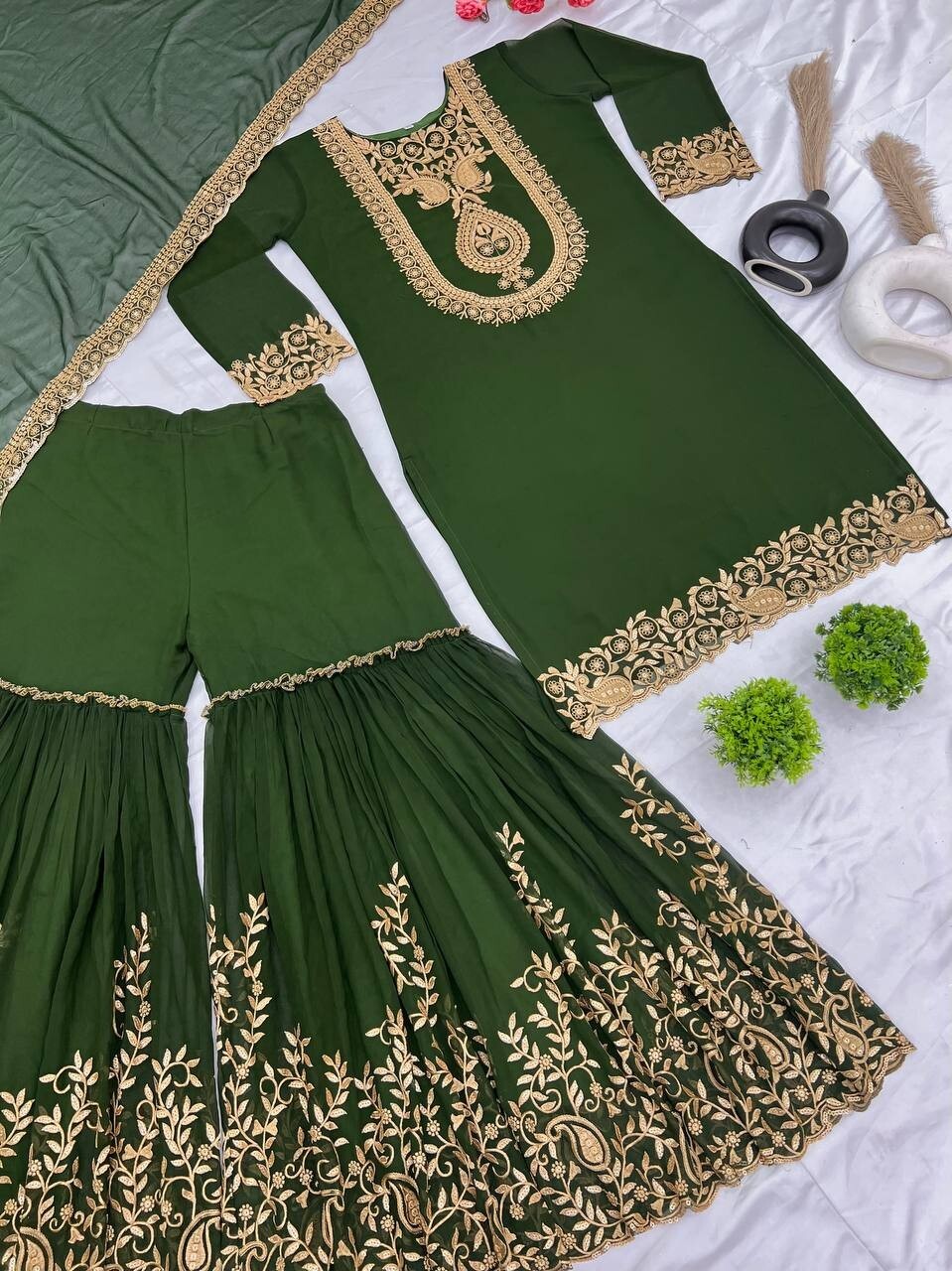 Designer Faux Georgette Mahendi Green Kurta Palazzo With Dupatta For Party