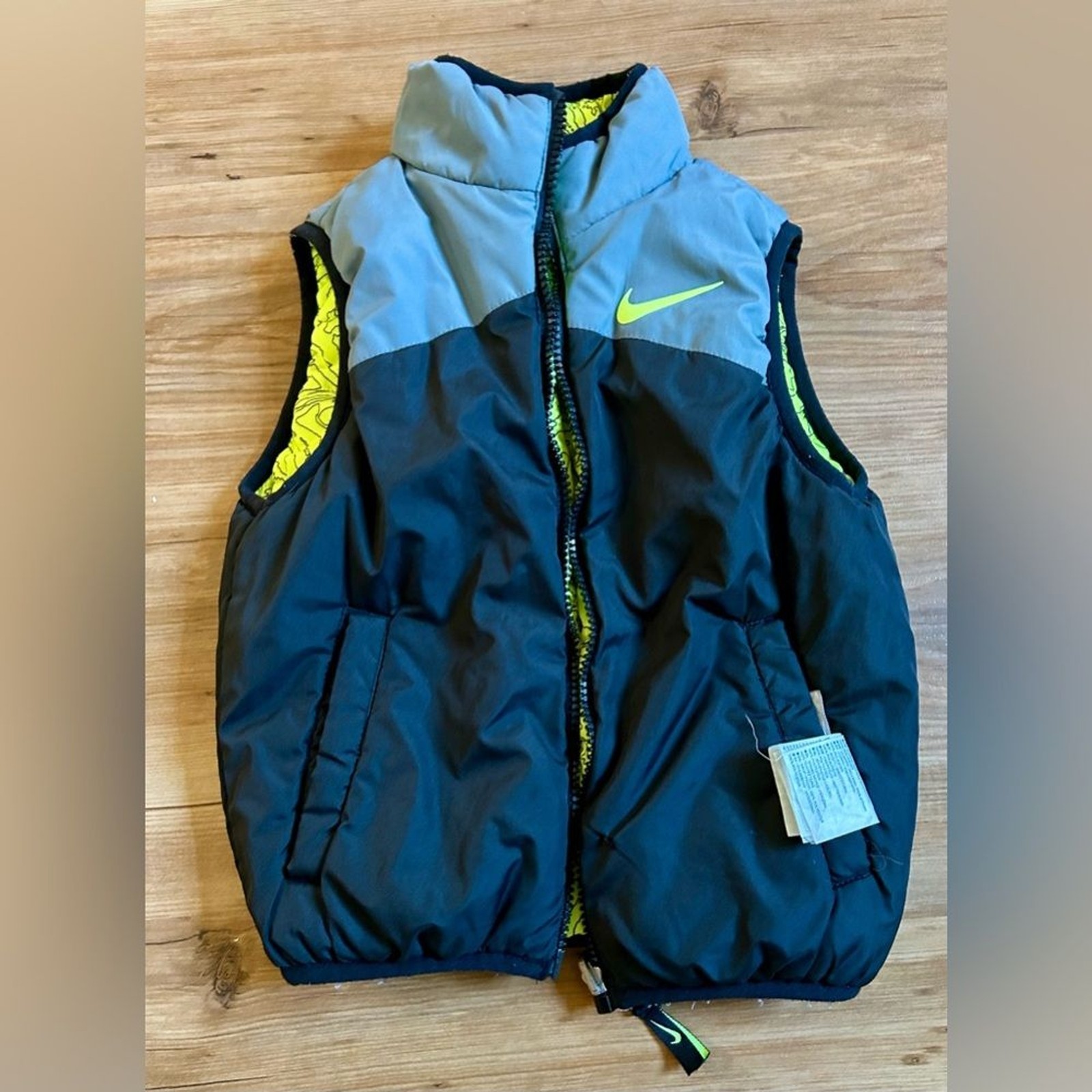 как выглядит Nike Reversible Neon Electric Yellow Puffer Vest Kids 4/XS Dark Light Gray Zip фото