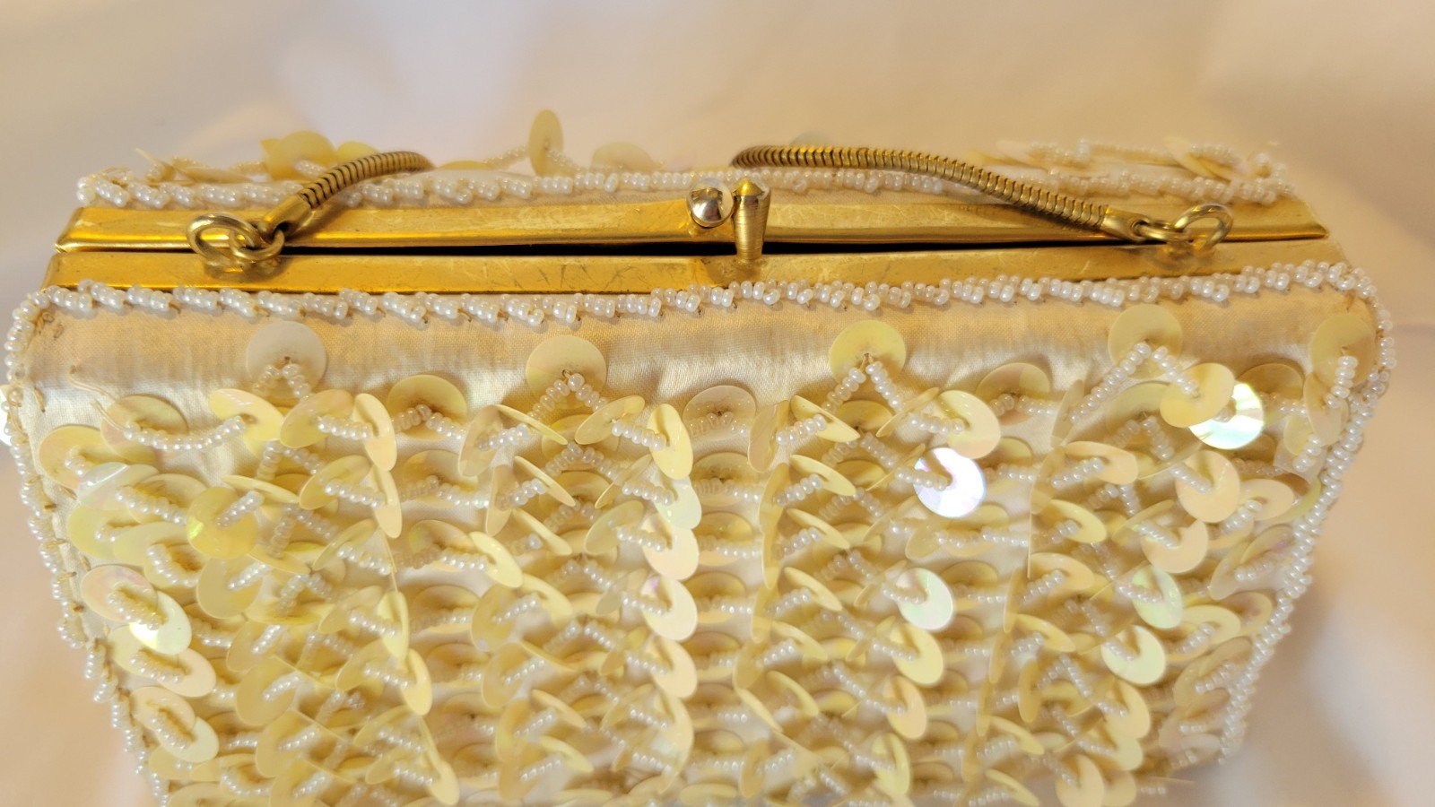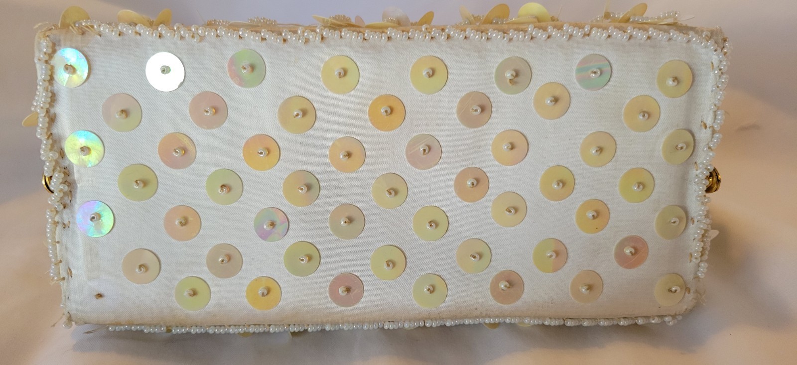 VTG Handmade Sequence Beaded Evening Bag Ivory With Gold Trim PURSE PROM