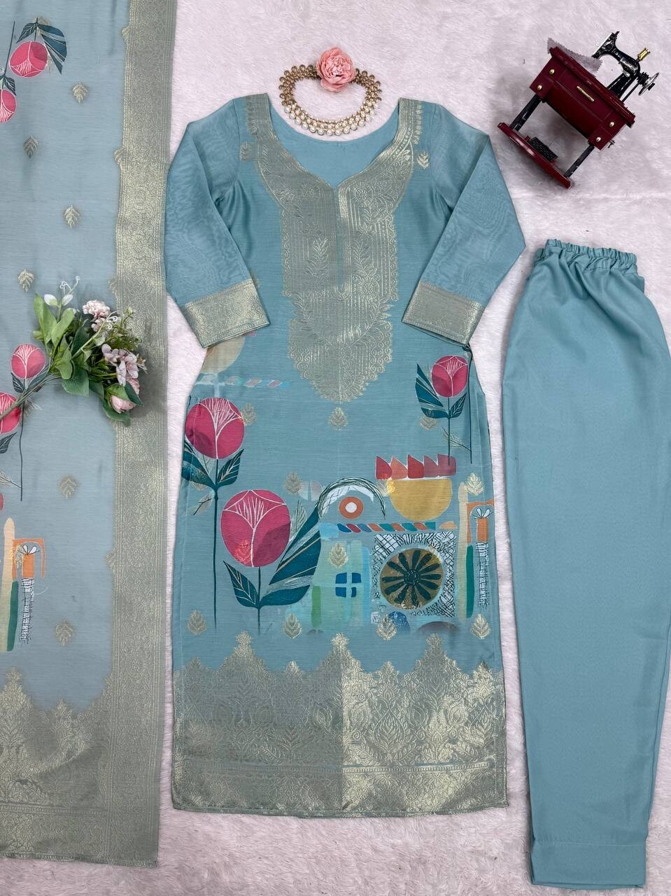 New Latest Chanderi Silk Light Blue Salwar Kameez With Dupatta For Party Wear