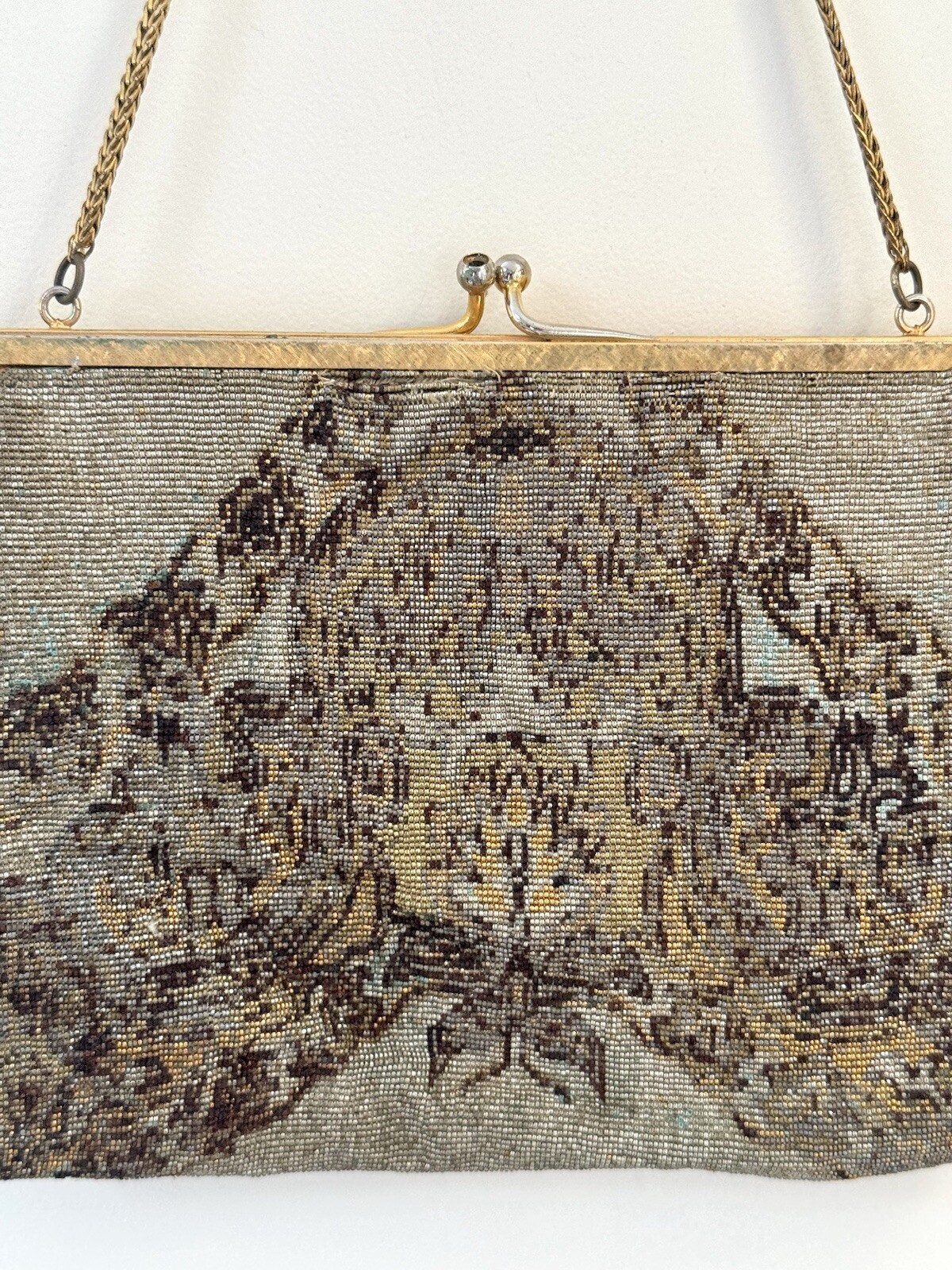 Vtg 1930s French Micro Beaded Handbag, Art Deco Gold Silver Beads, Chain Strap