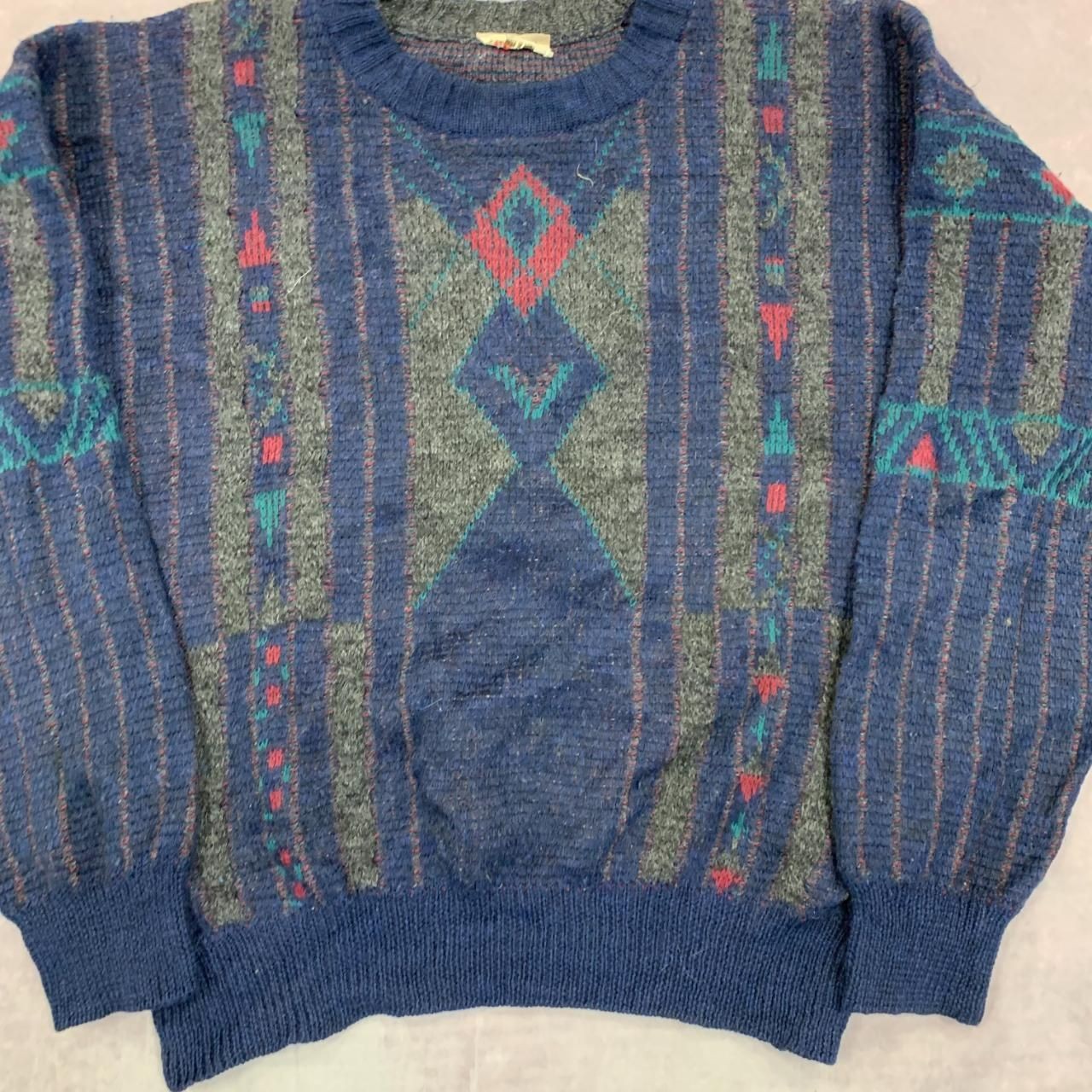как выглядит Vintage abstract knitted jumper Patterned Grandad chunky knit sweater Mens L фото