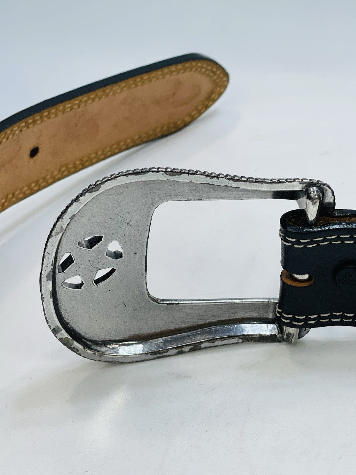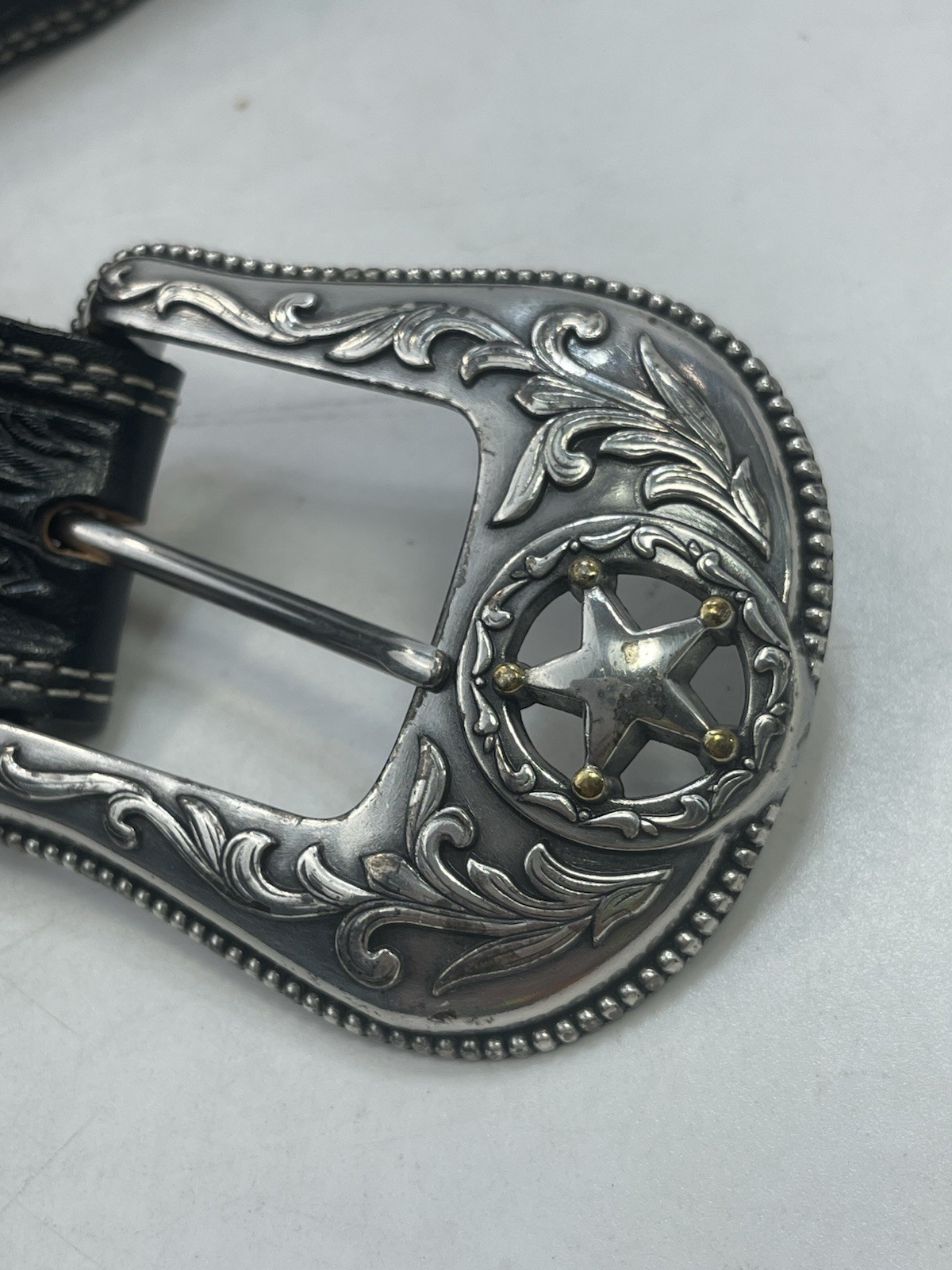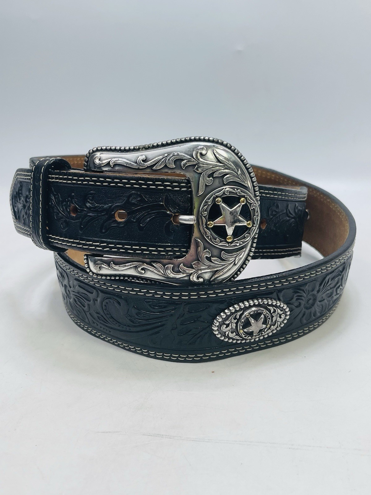 как выглядит Justin Mens 42 Belt Black Leather Ranch Star C12423 Western Tooled Concho USA фото